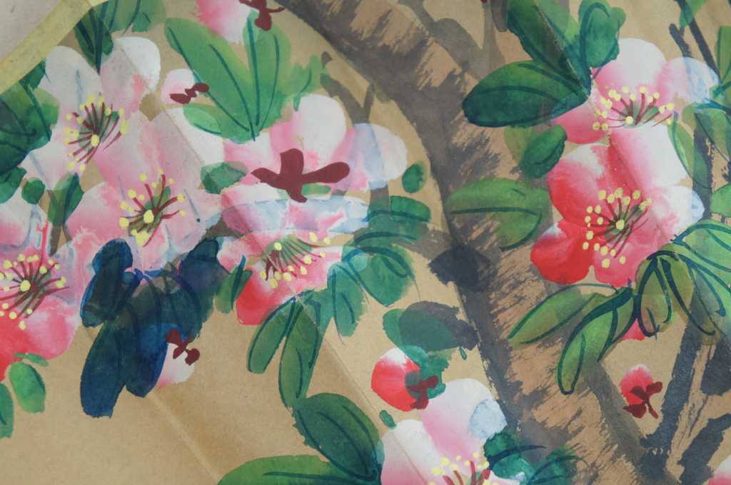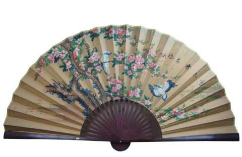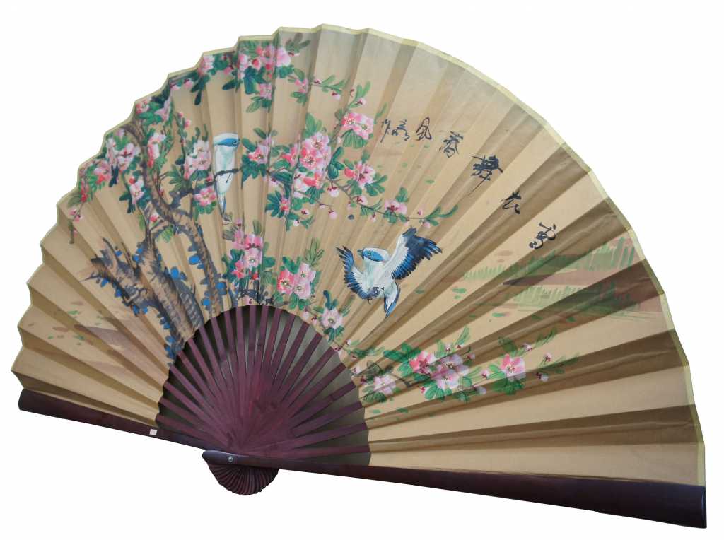 A lovely large hand painted and signed Chinese hand fan. A vivid screen with a cherry blossom and bird scene. From Shaghai
