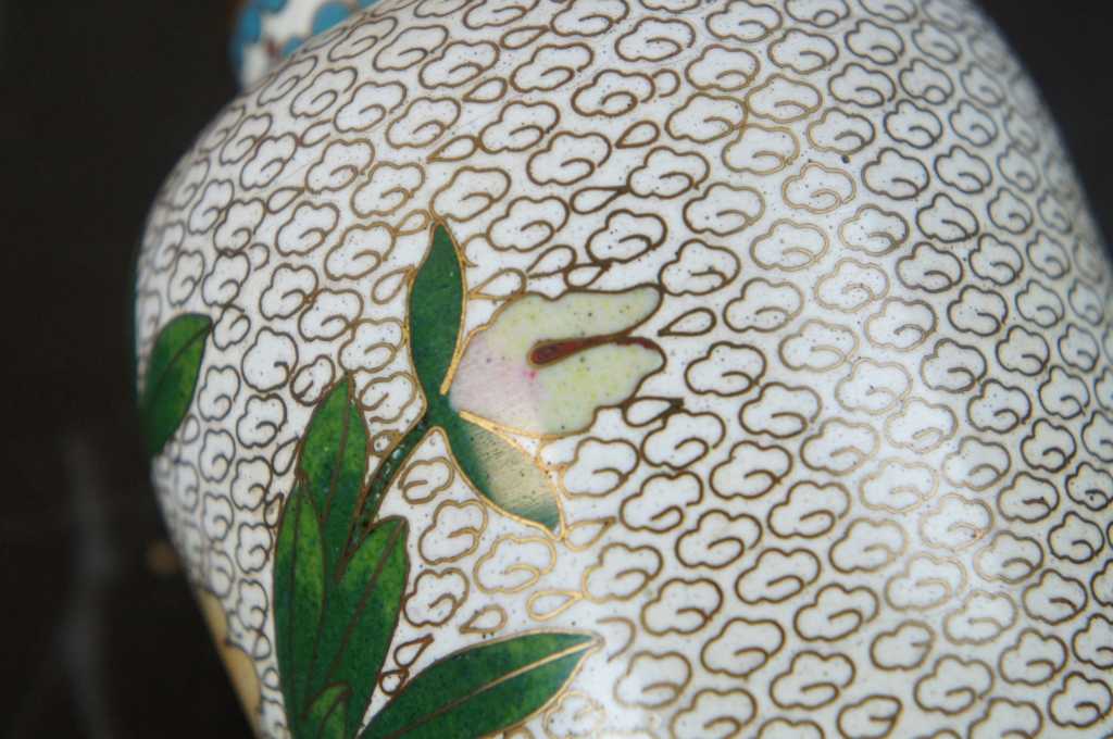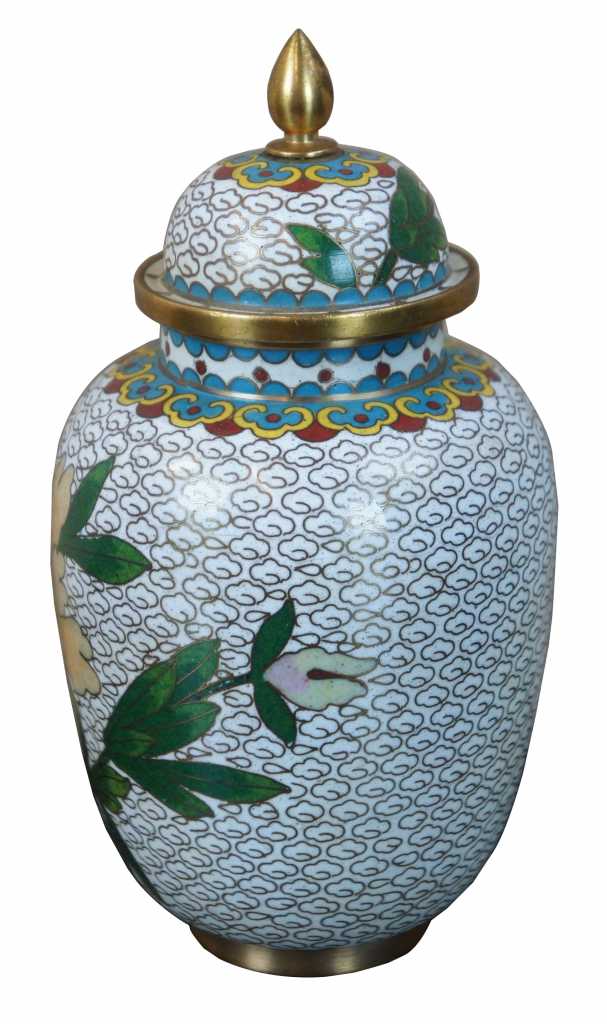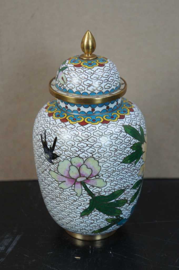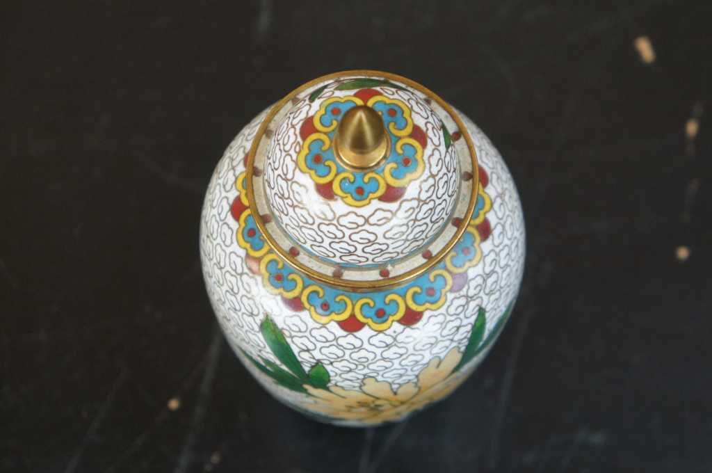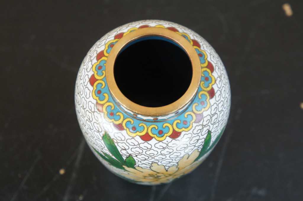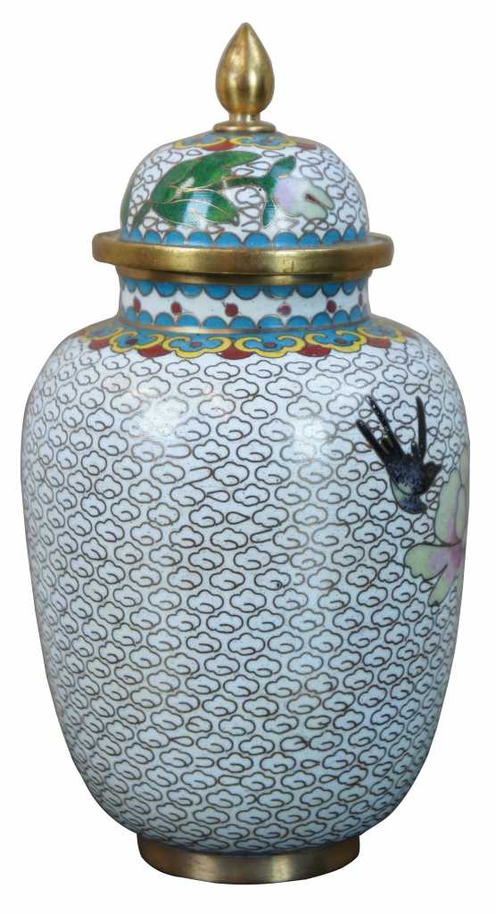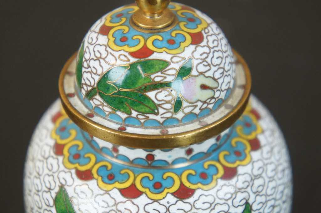 Nice white enamel lidded cloisonne urn; features field of white clouds, flowers and a bird.