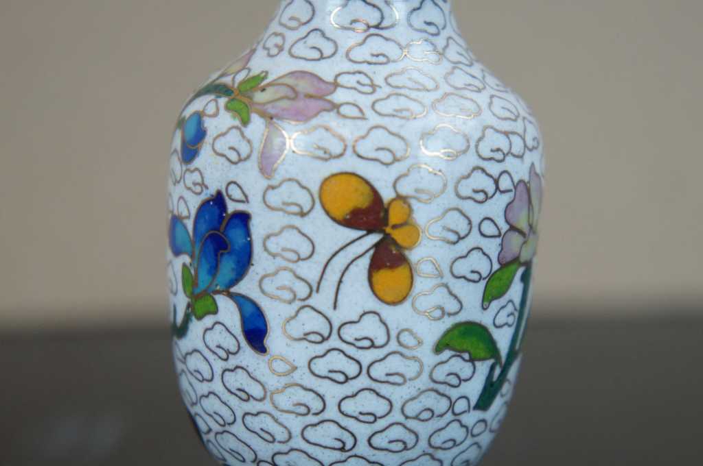Miniature 3'' Cloisonne Vase & Stand; features field of white clouds with floral accents and wood stand.