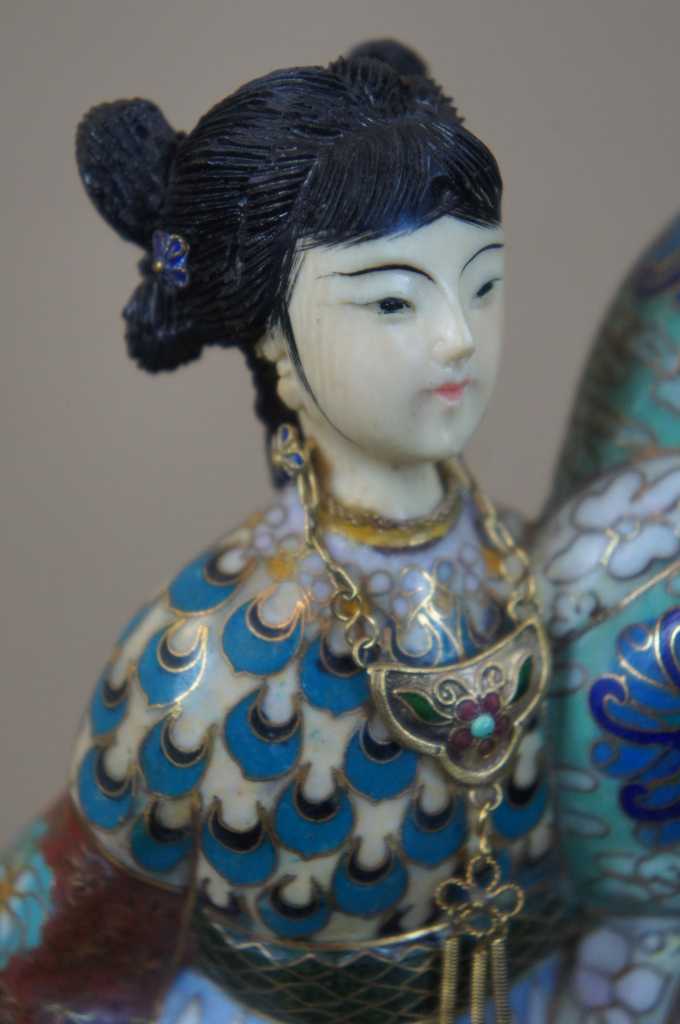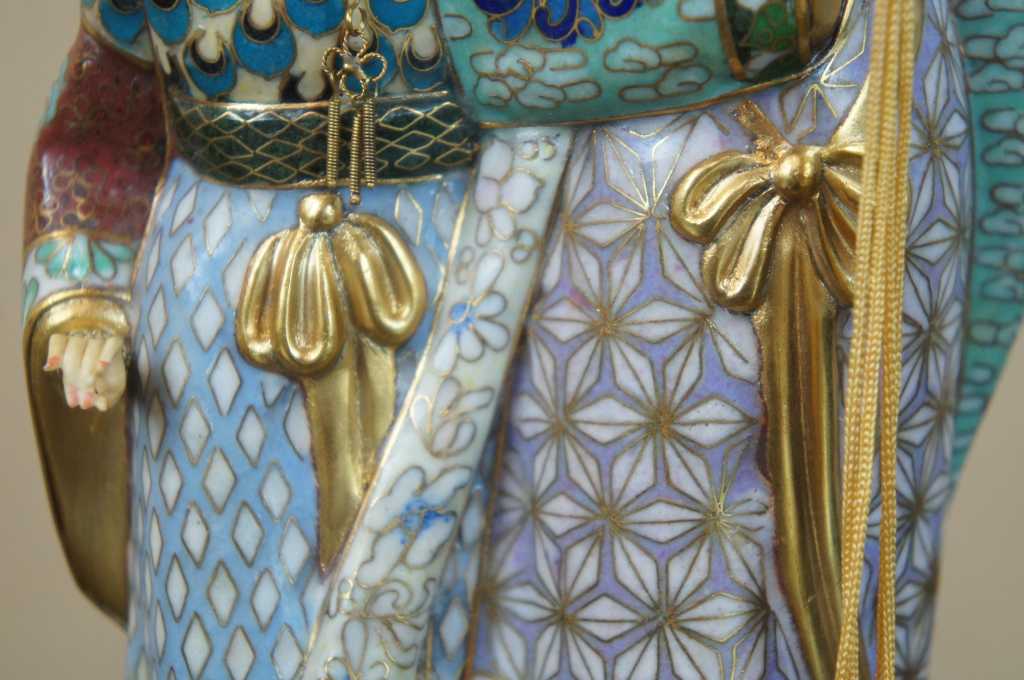 Stunning enameled cloisonne figurine depicting two female Geishas on wooden base. One has a headress and the other has a sash, both have articulating jewelry and gold trim