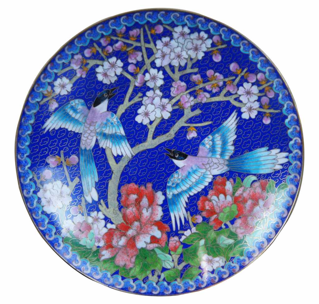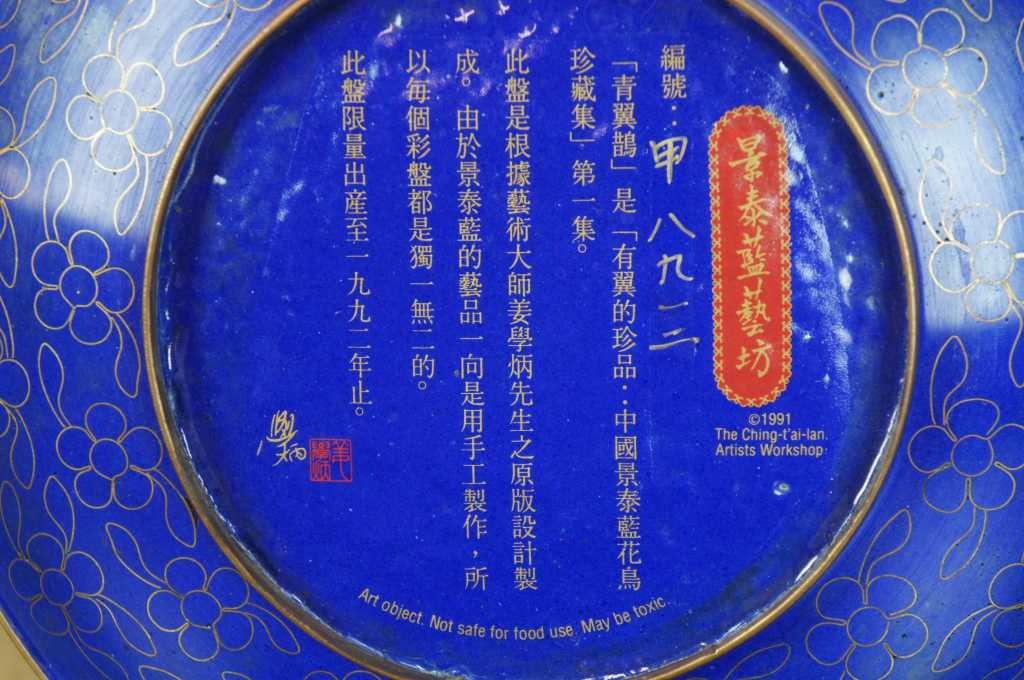 1991 Chinese Cloissone Plate Azure Winged Magpie Ching t’ai Lan Artists Workshop