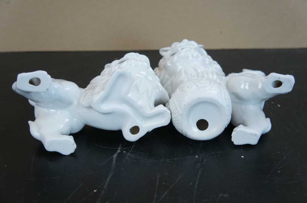 A fun pair of white porcelain foo dogs with winged tails.