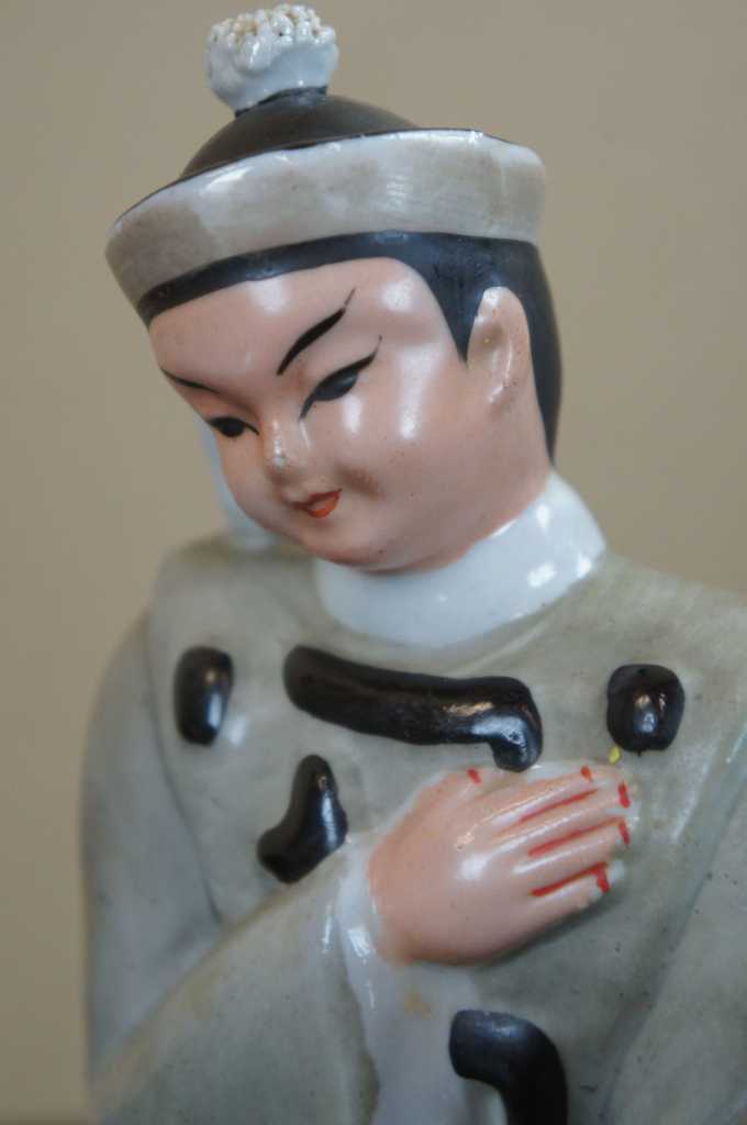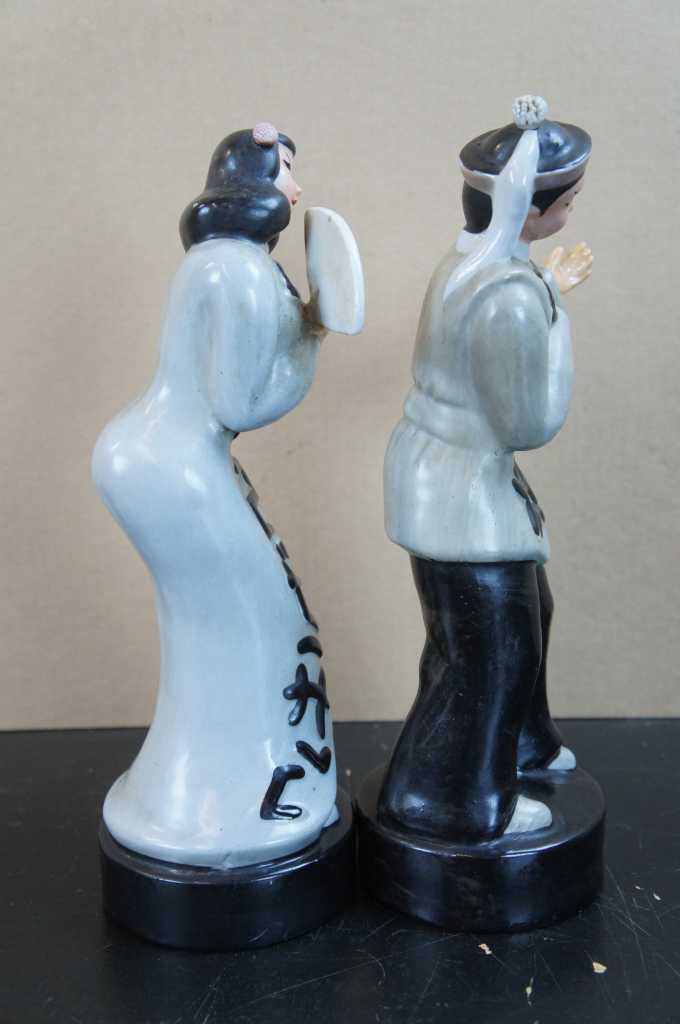 Japanese porcelain dancers. Features a man and a lady dressed in gray with calligraphy apparel. Madei n Occupied Japan, 1950s