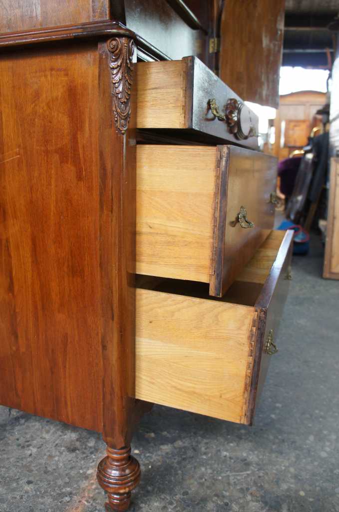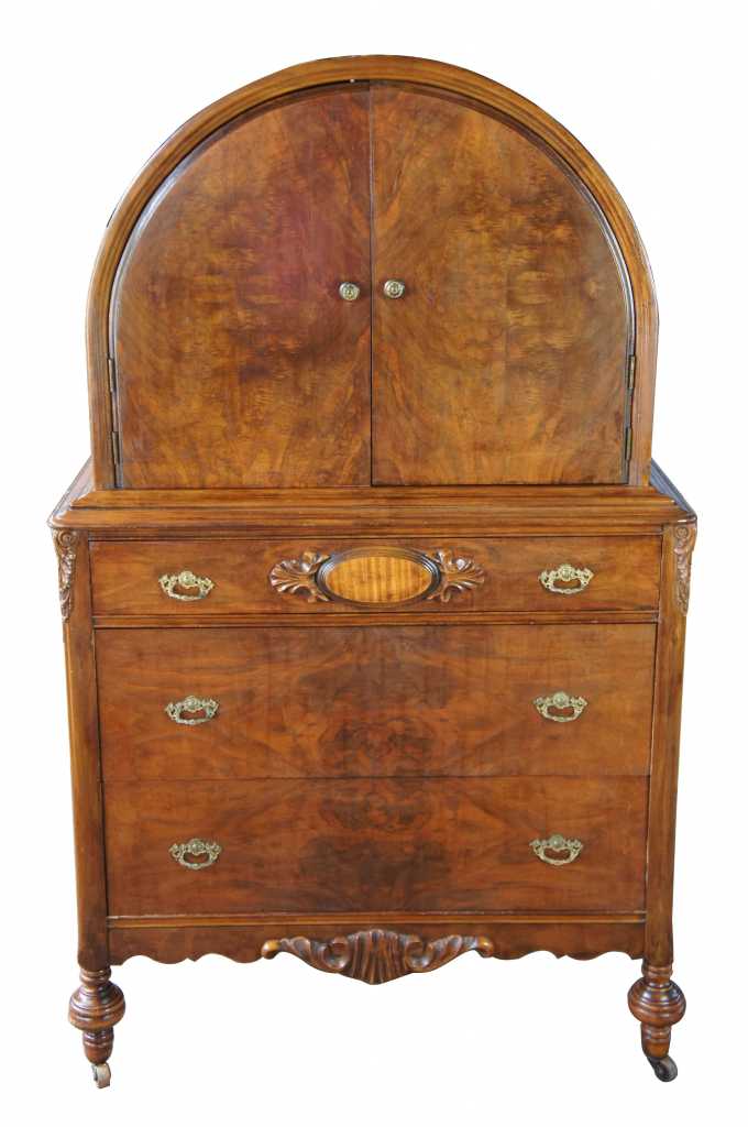 Visually appealing Art Deco cabinet by Chicksaw Furniture Mfg Co of Memphis Tennessee. Made from walnut with carved accents and a crotch front. Great for use as a dresser, dinning room buffet or sideboard. Uniquely designed with a domed top and Victorian flare. Features 4 drawers (one internal) and shelf. Lower feet are turned with casters.