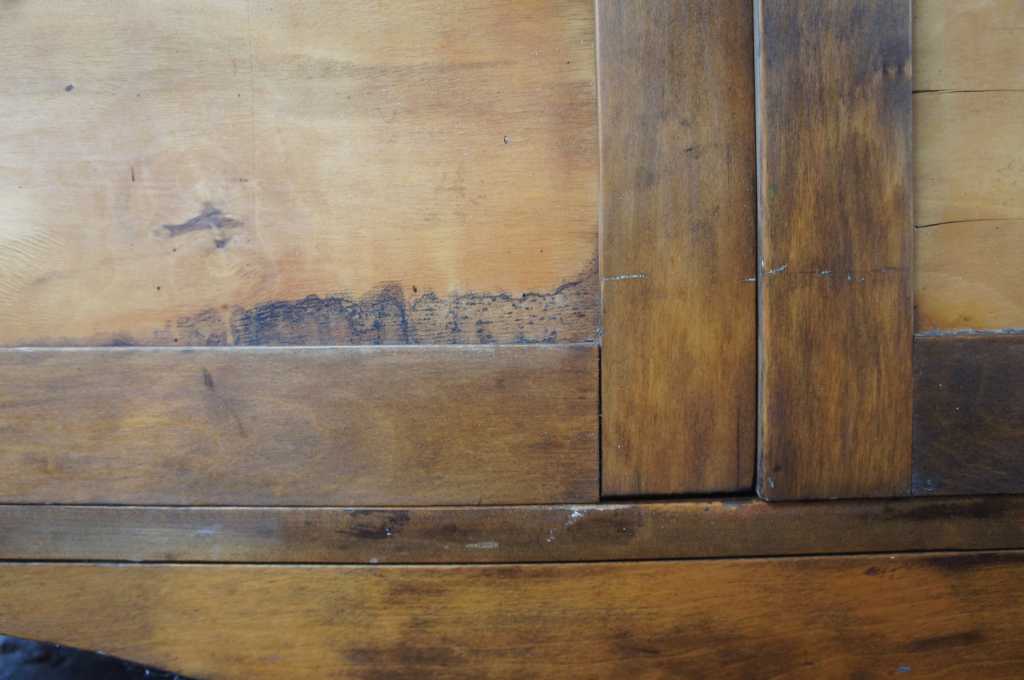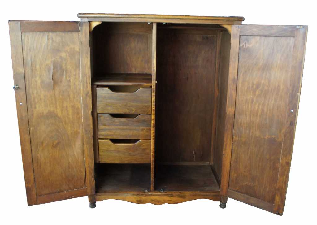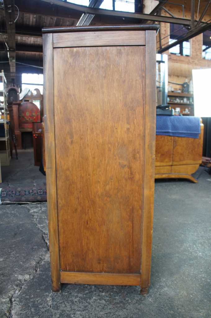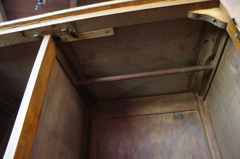 A lovely 1930s chifferobe. Made from walnut with a maple veneer inset along the front doors. Opens to drawers and shelves along the left and a hanging bar to the right.