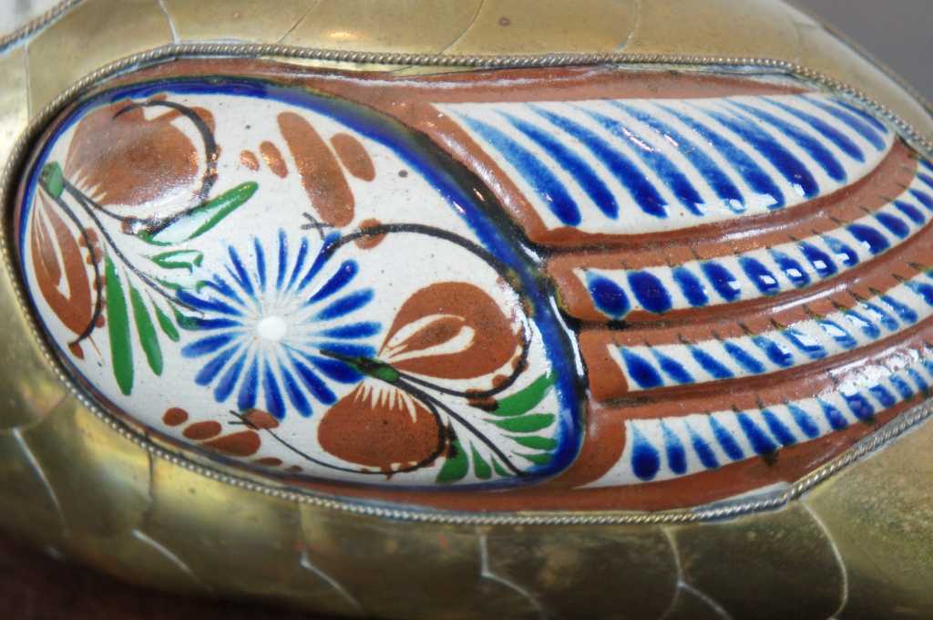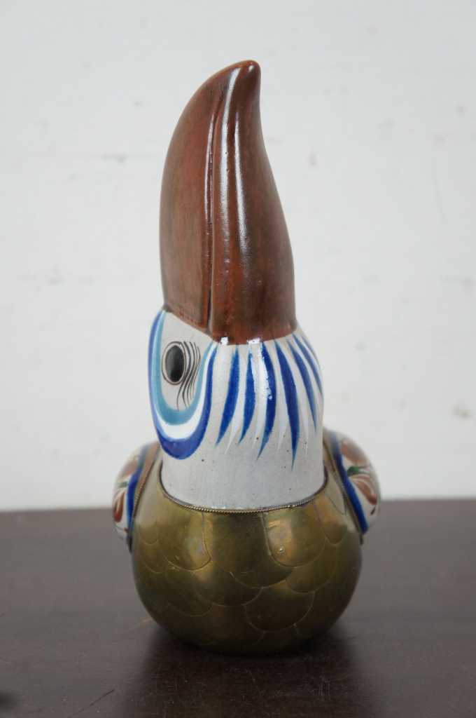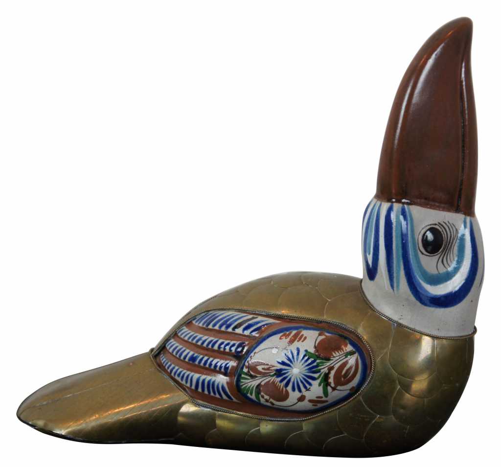 A lovely Sergio Bustamante inspired toucan sculpture. Made from brass with ceramic painted wings and face. Intricately detailed with layered wings and embossed accents along the tail. Perfect for display along a shelf or table surface.