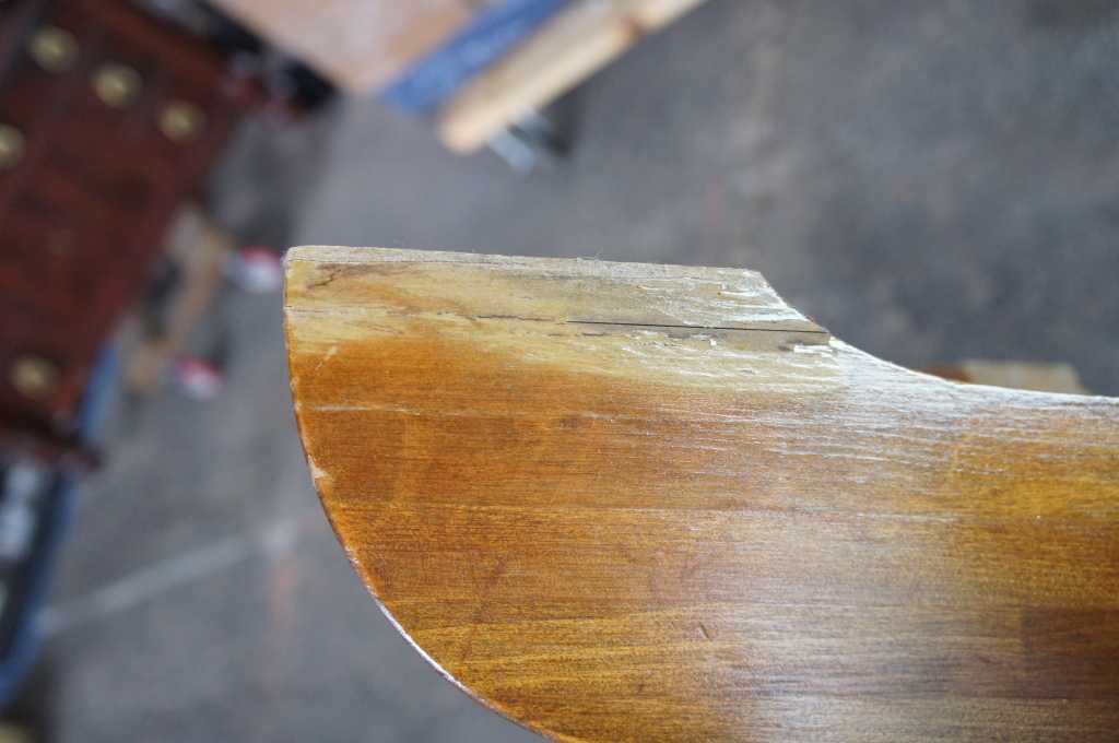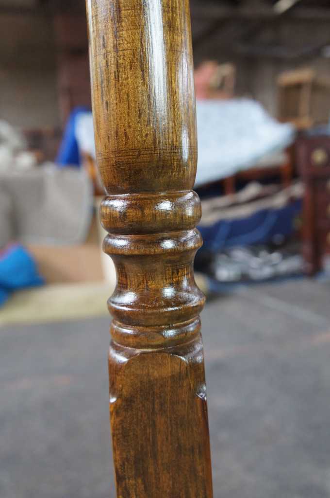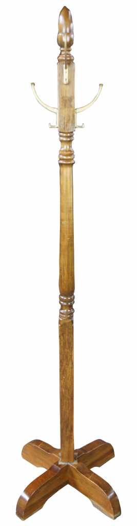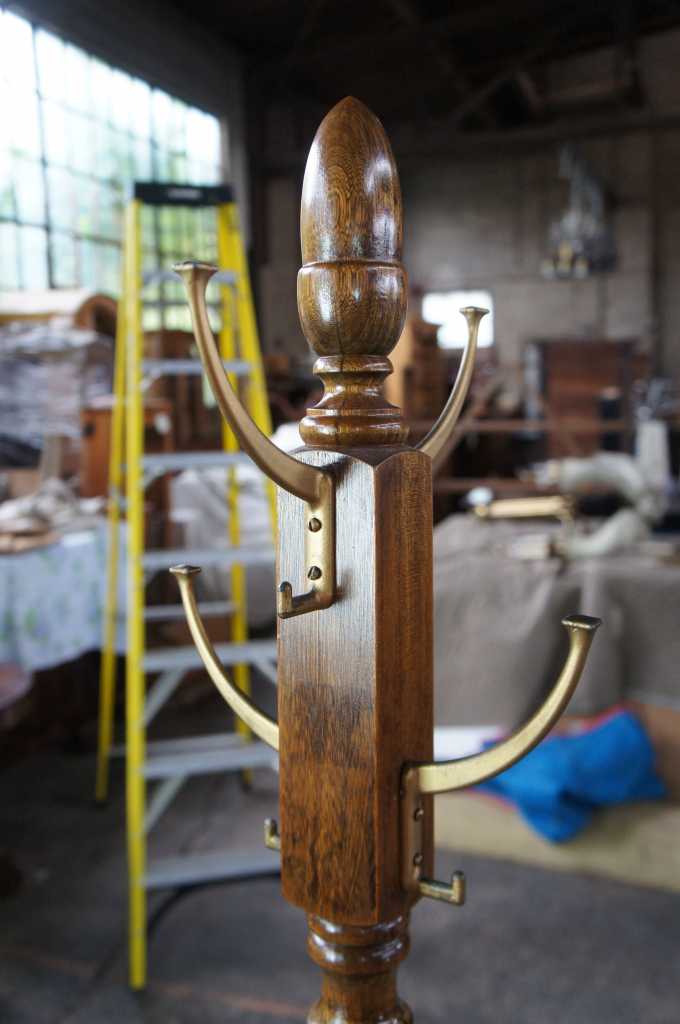 Colonial Revival coat rack. Made from pine with 4 brass hooks and an acorn finial.