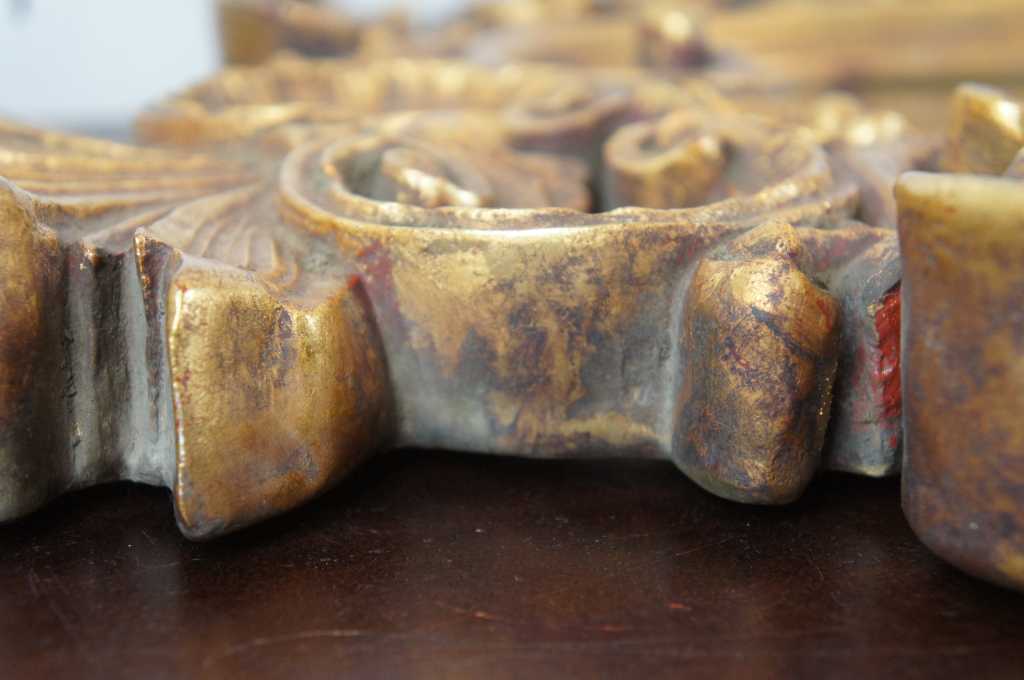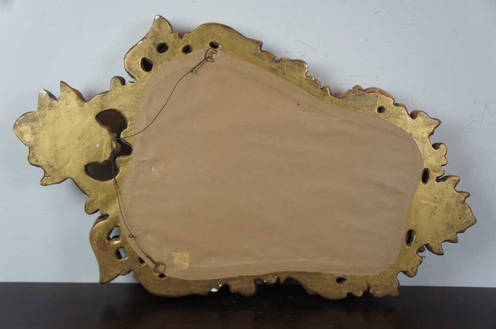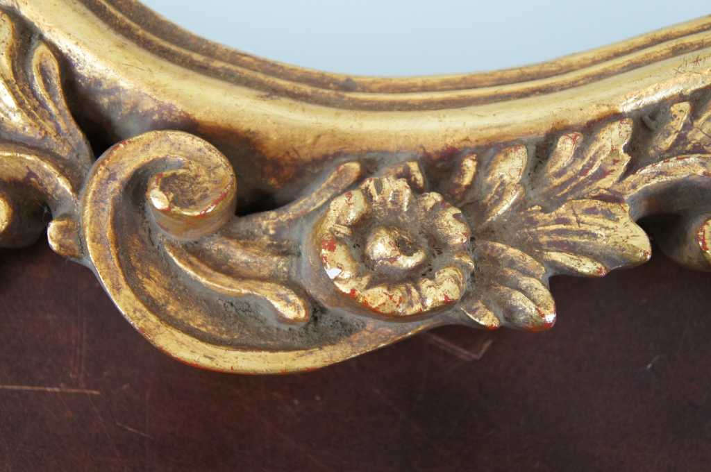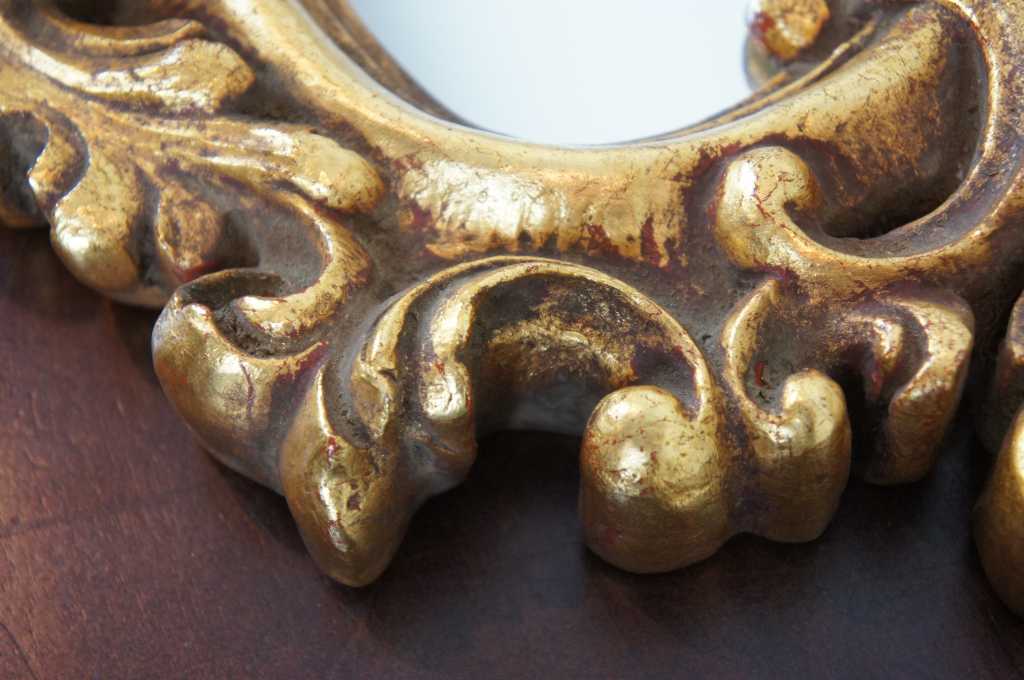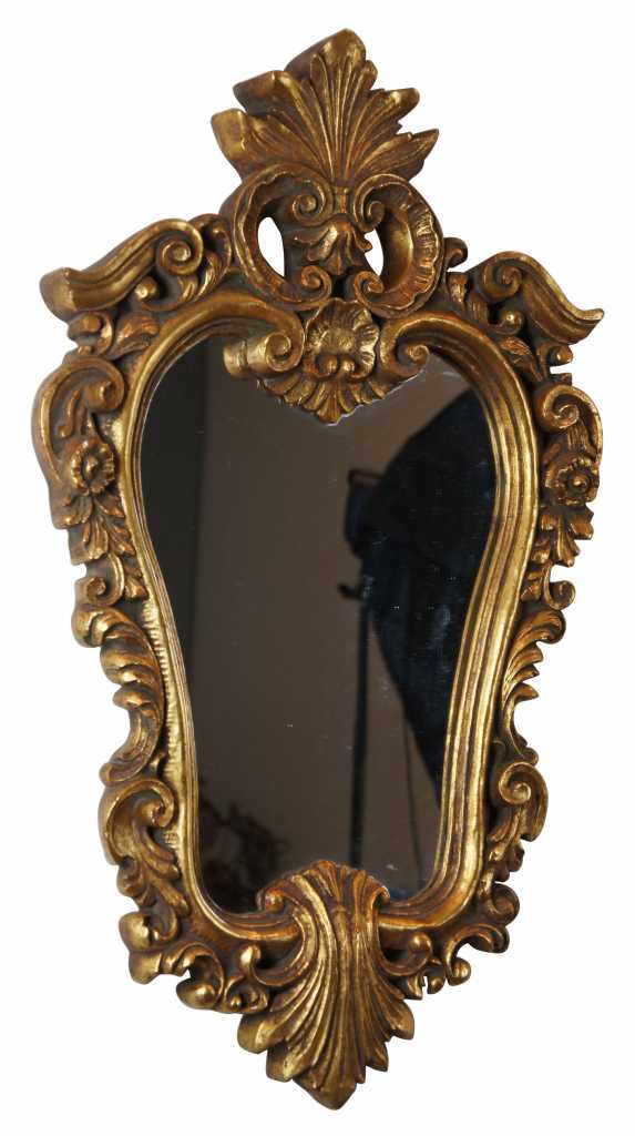 Baroque inspired wall hanging mirror. Perfect for an entryway, hall or bathroom. Finished in antique gold