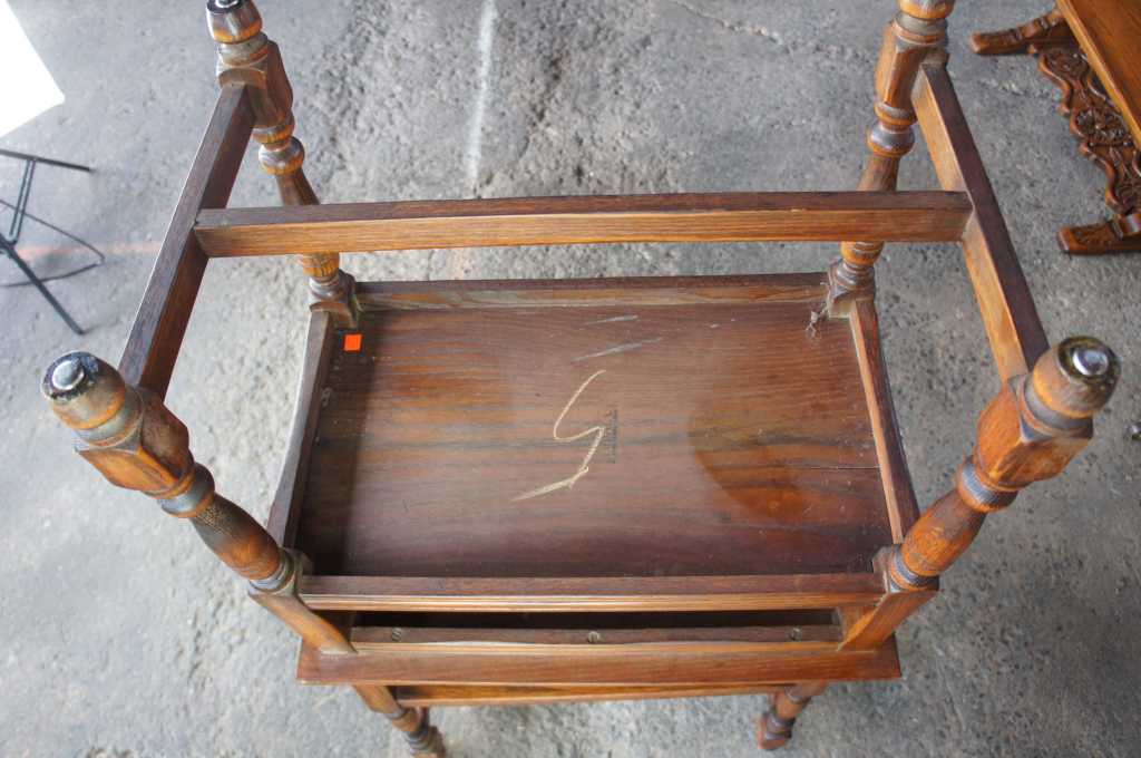 Feudal Oak Jamestown Lounge Co Spanish Revival Side Table. Features an open shelf with a pierced grapevine design along the sides. Perfect for use in any setting.