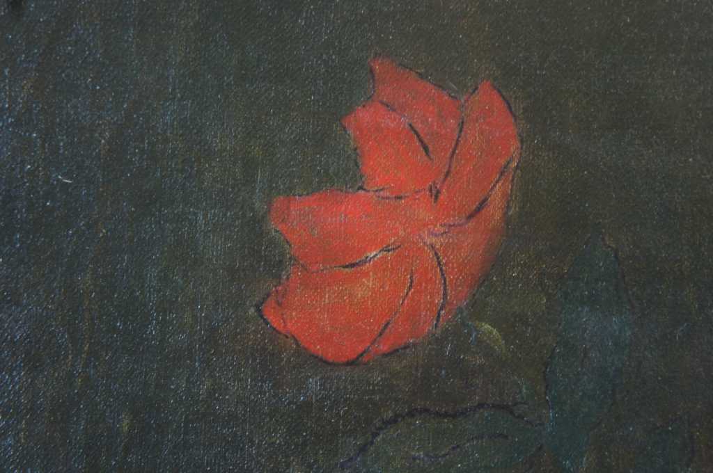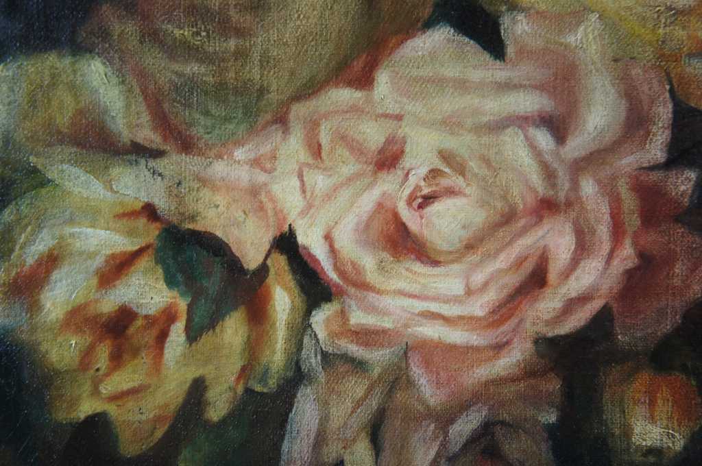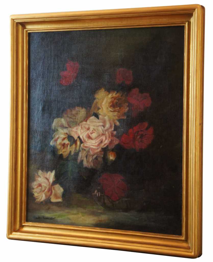 19th Century floral still life oil; featuring red and pink roses in a vase