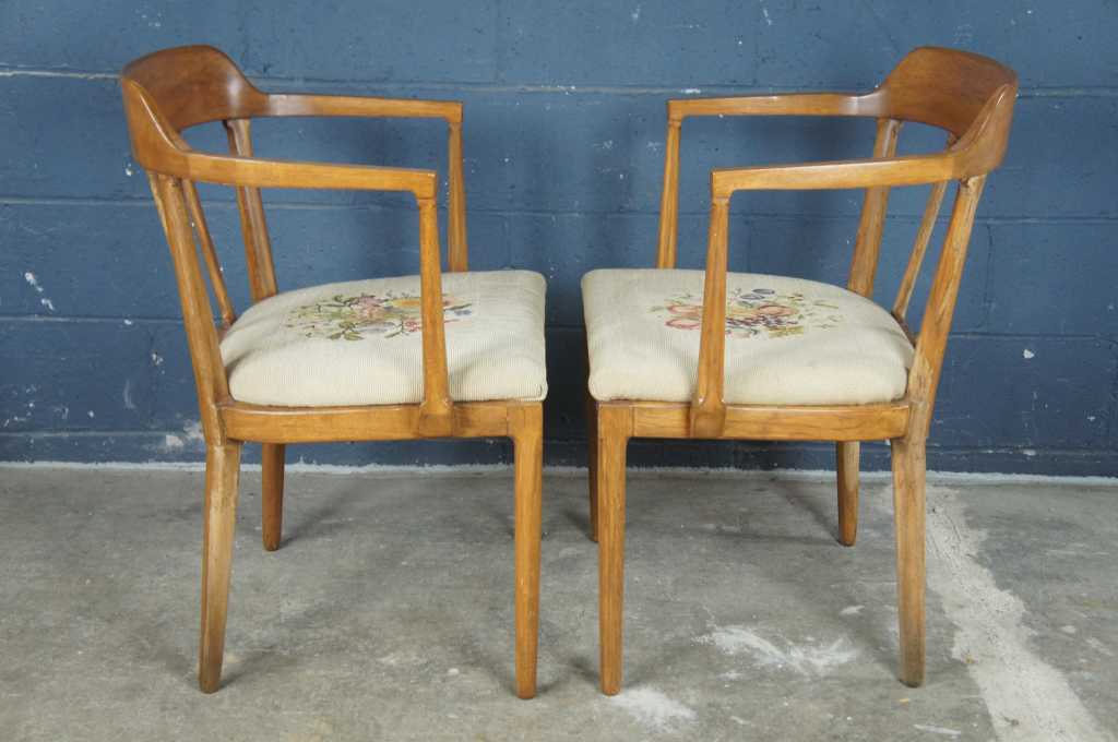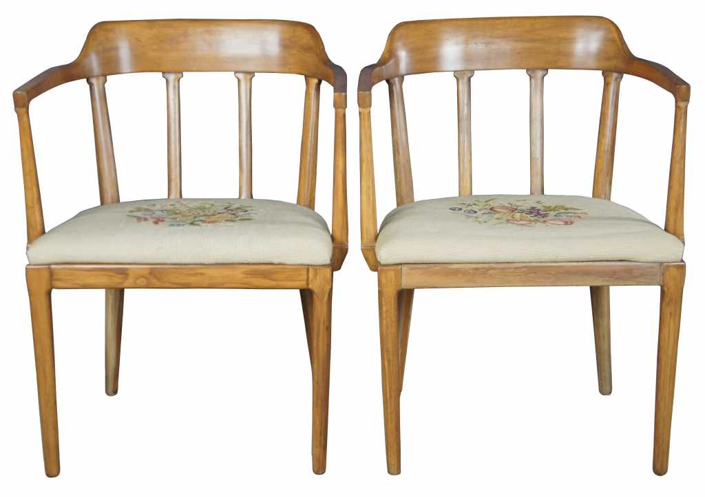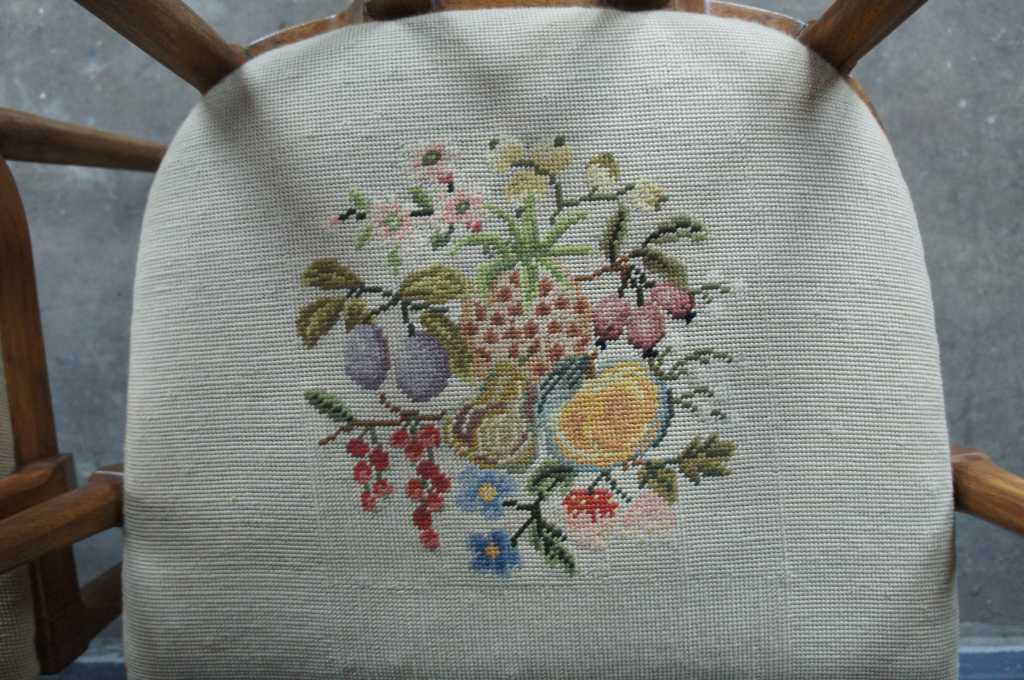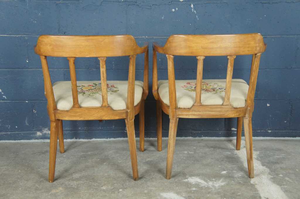 Made from walnut with a barreled slat back and embroidered seat