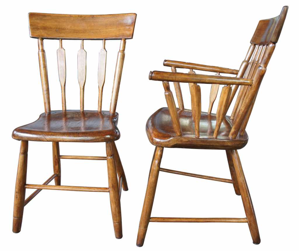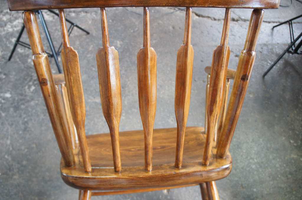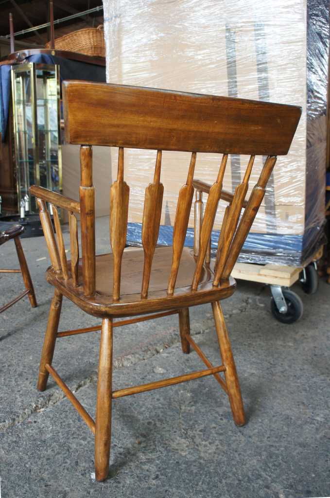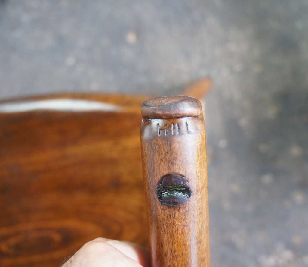 A lovely set of 4 19th century solid oak spindle back dining chairs. Three side chairs and one gentleman's arm chair. The arm Chair is marked Hill along the top of one arm with an "H" carved into the other arm.