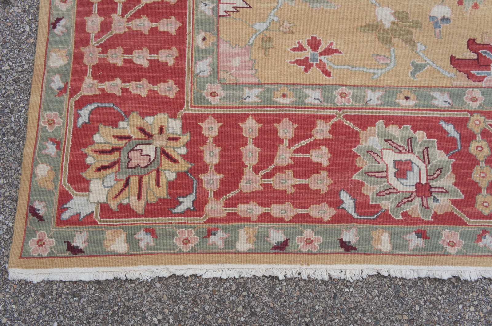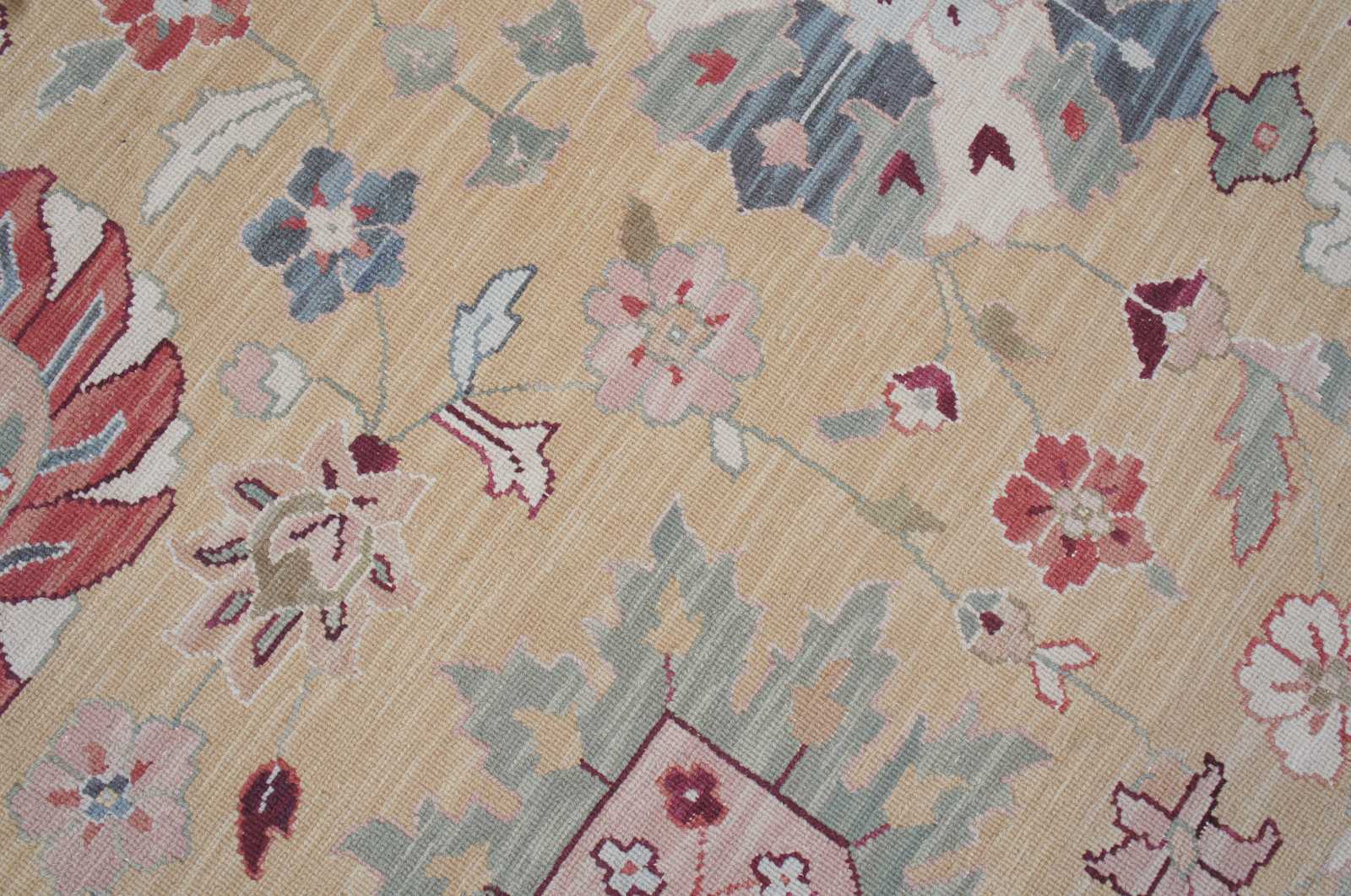 Dreamy, flowerlike shapes arranged in geometric harmony present an exceptional design for the discerning collector. The glowing golden ground is highlighted by delicate details in cinnabar, peach and bay leaf. Large flowerheads interspersed with tiny blossoms create beautiful interplay. The border is equally refined. A hypnotically appealing rug.