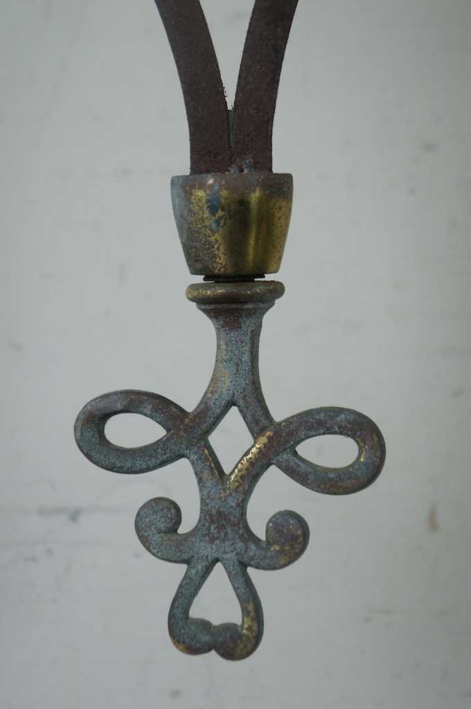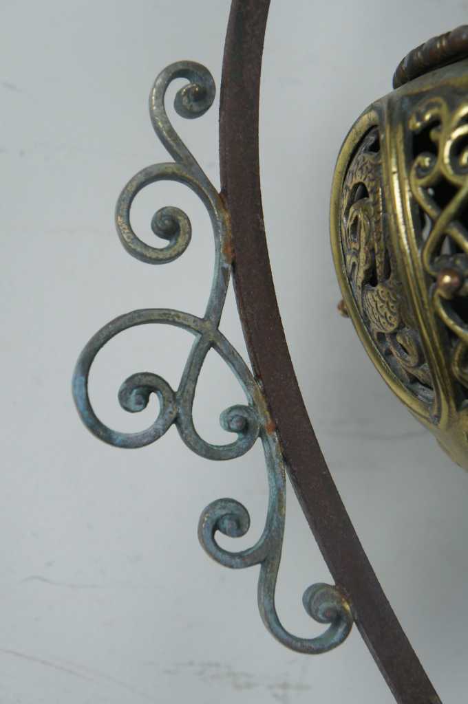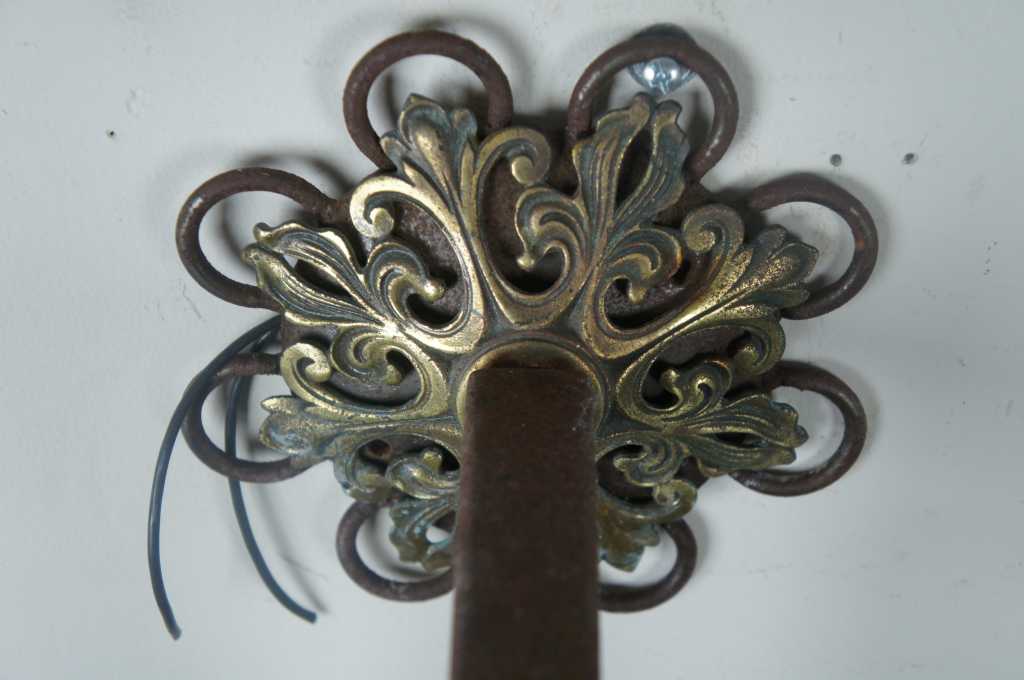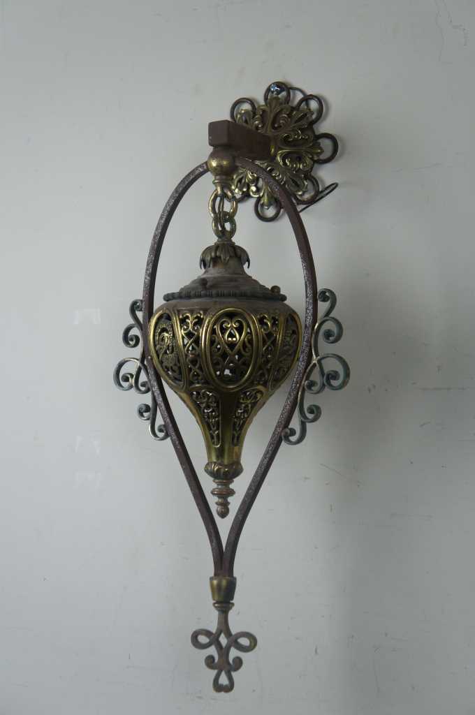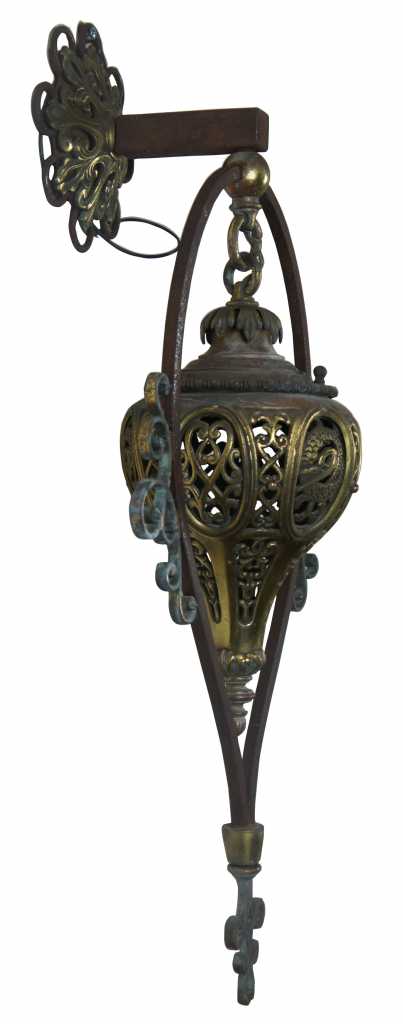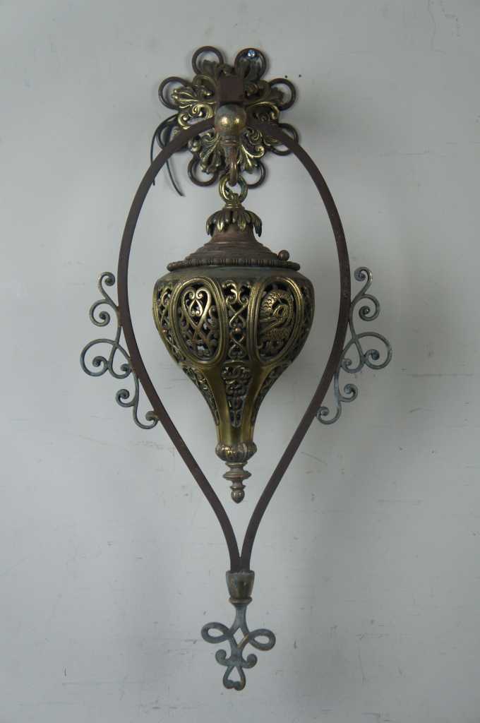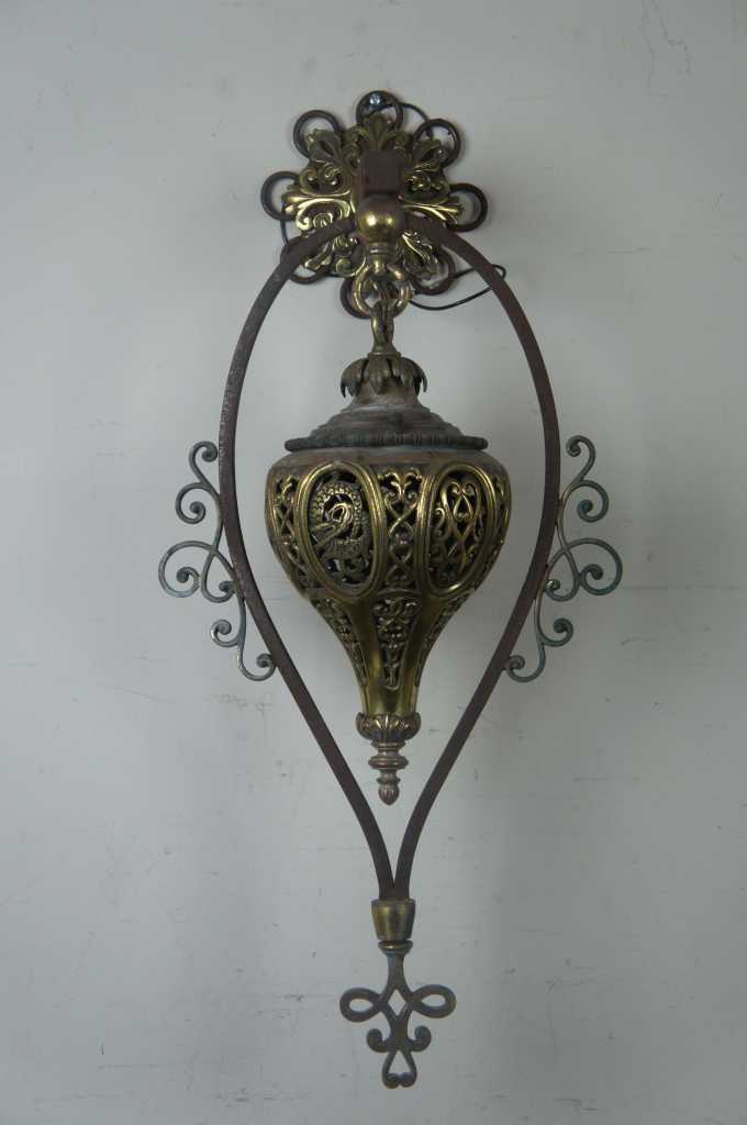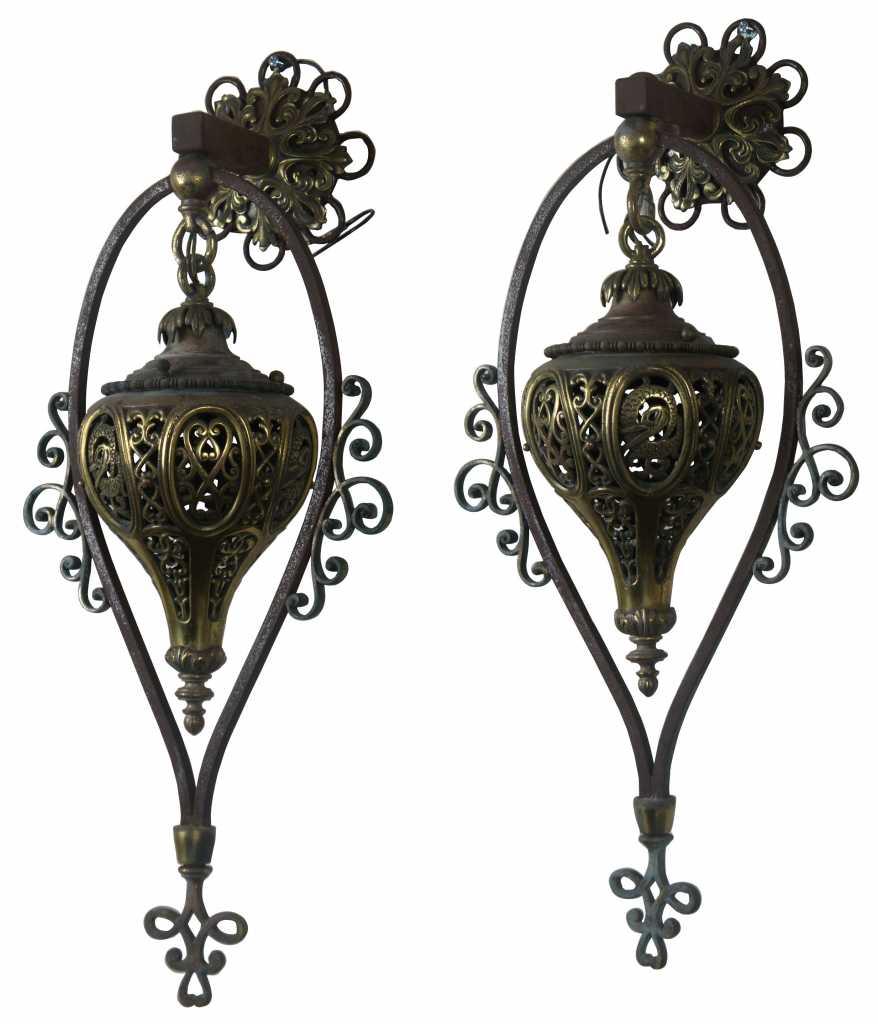 A stunning pair of Moorish Moroccan style wall sconces. Made from iron with a pierced brass downward hanging lantern. The perfect statement for any space