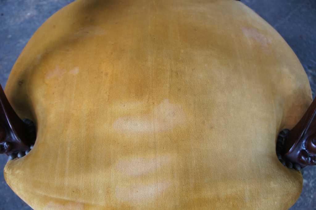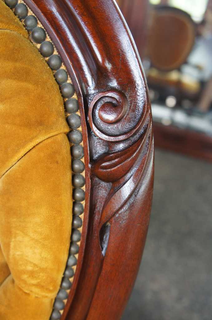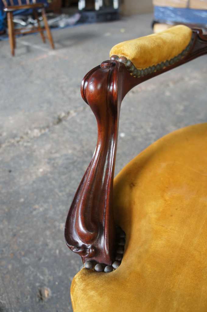 Circa 1870s Victorian Gentleman's chair. Made from Mahogany with flared arms and tufted balloon back. Upholstered in gold with nail-head trim. A glowing example that will look remarkable in any setting.