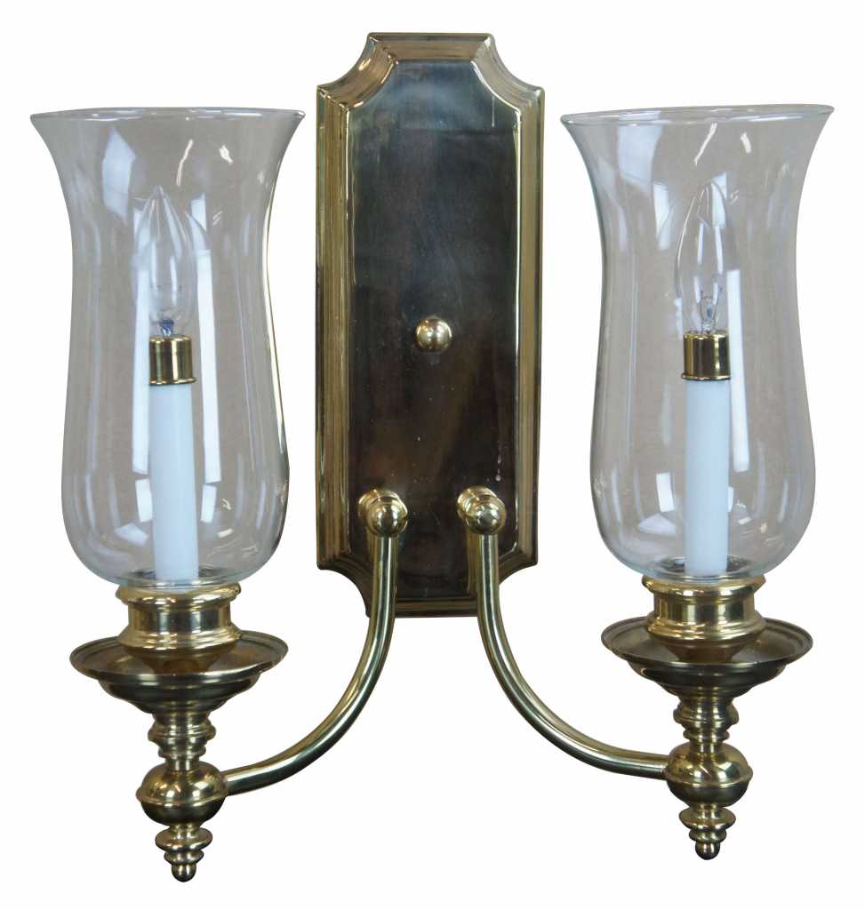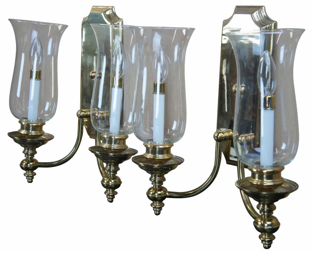 2 Kichler Lighting electric hurricane wall sconces. Beautifully designed in traditional styling with polished brass and glass globes.