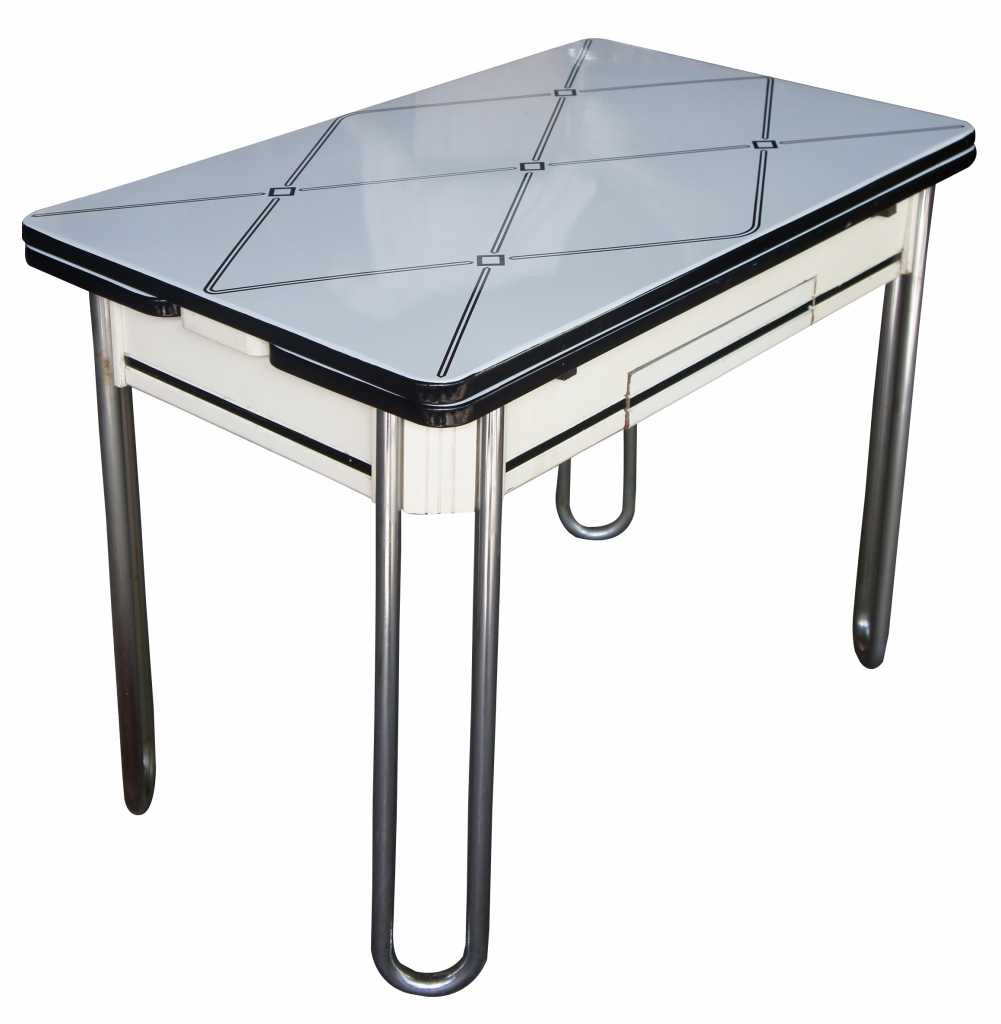 Mid century Kleerchrome breakfast table by Empire Table Co, circa 1950s. Comprised of a wooden base with silverware drawer, chrome legs and an enameled expandable top. The top is white with black edge and a geometric diamond pattern. A fun addition to any vintage space