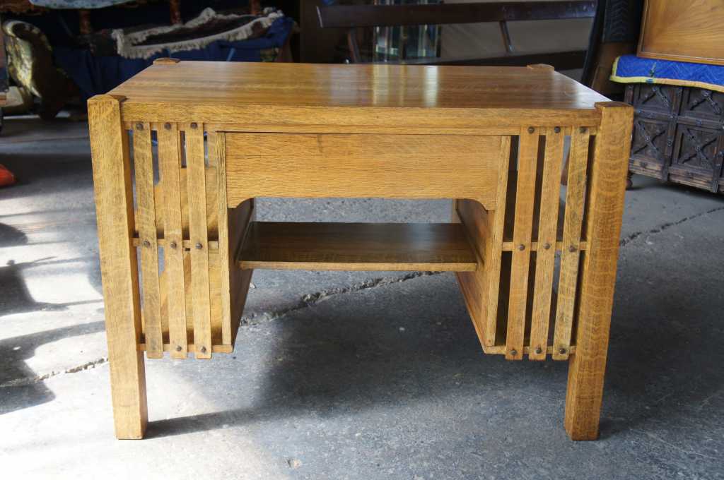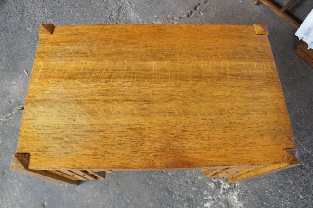 A lovely 20th century quartersawn oak library table. Perfect for an office or library. Complete with two shelves on each side for books, a knee hole shelf and a central drawer for accessory storage. A nice compliment to any collection