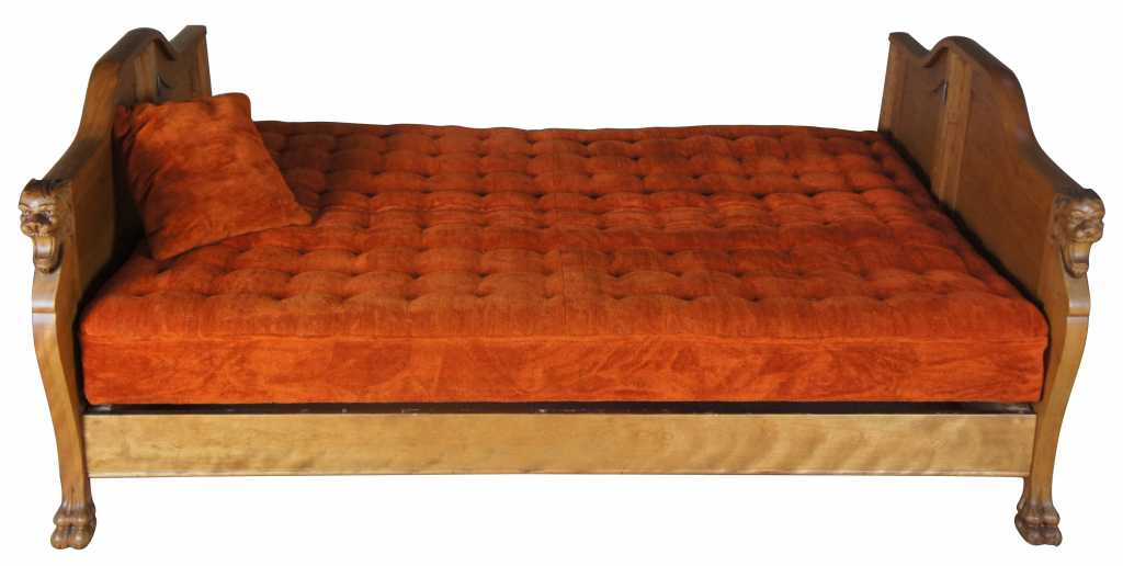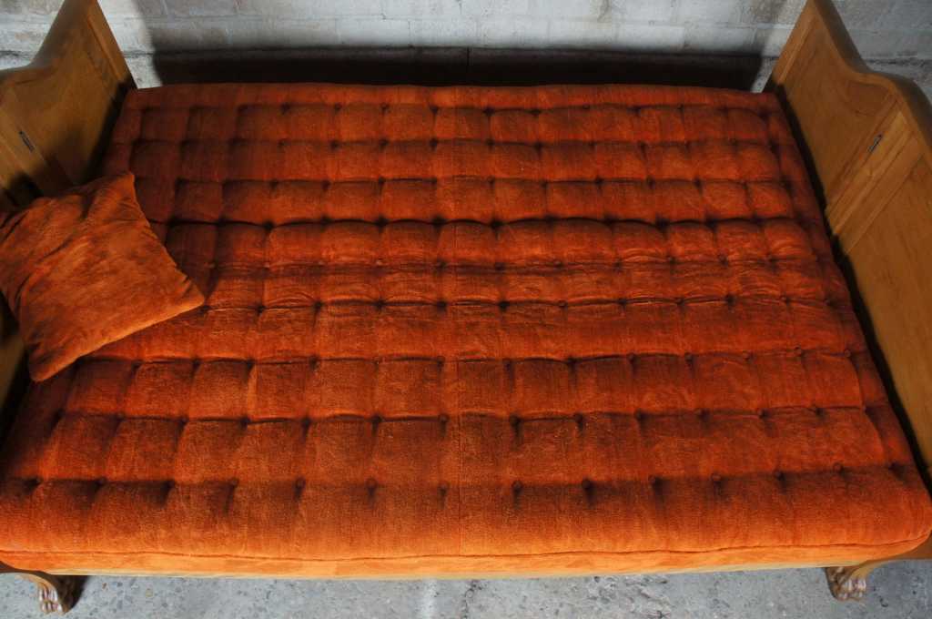 Amazing Victorian era sofa bed by Schauss MFG of Cleveland Ohio. Schauss operated from the late 19th century to the early 20th century. This sofa is made from Walnut with lion head arms leading to paw feet. Features and orange tufted seat that can quickly turn into a lounge or day bed.