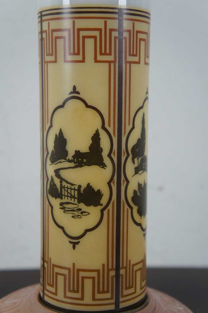 All-Lite skyscraper table lamp. Pink glass with country scene along the center.