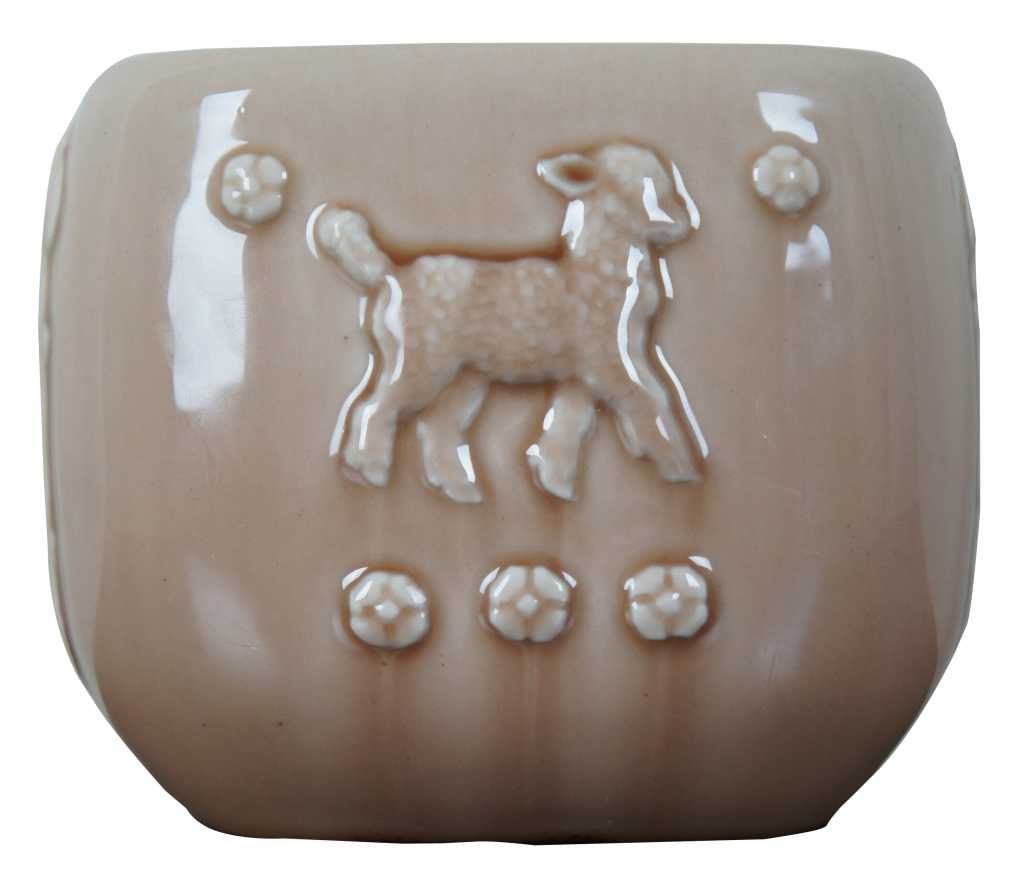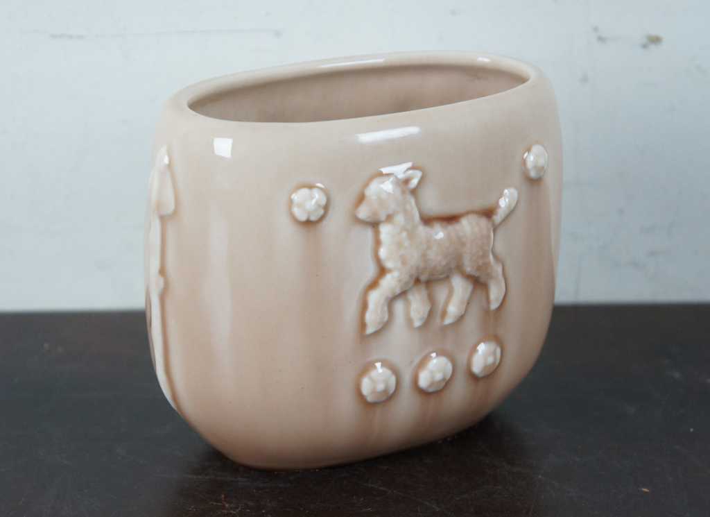 A 1946 Rookwood Pottery vase or planter with a taupe glaze and lambs in low relief to the front and back. Marked with pattern number 6957 to the base. Shape No. was used by rookwood between 1907-1967