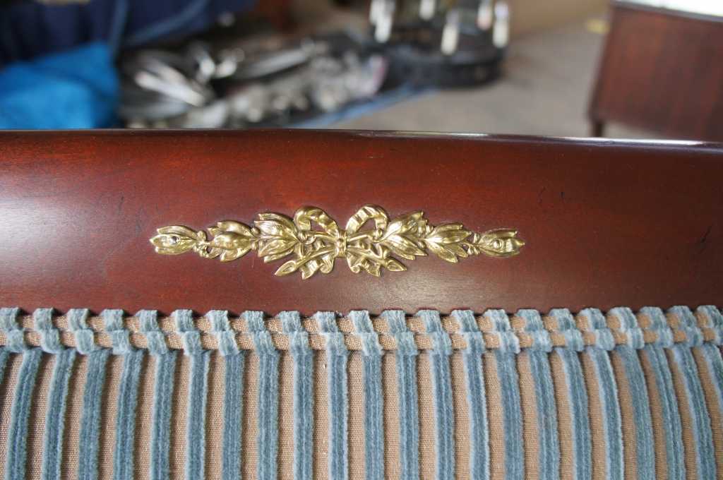 Made from mahogany with brass mounts and a blue striped corduroy upholstery.