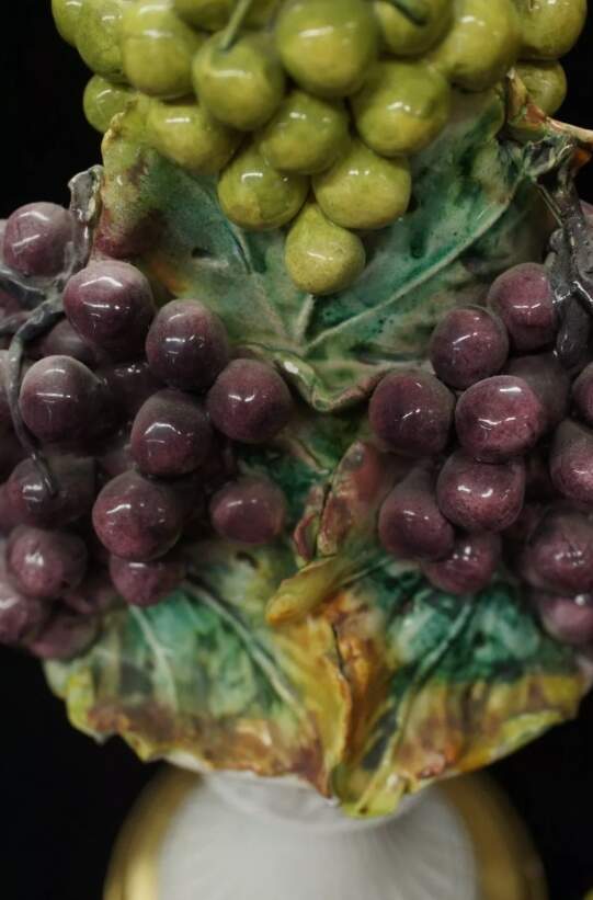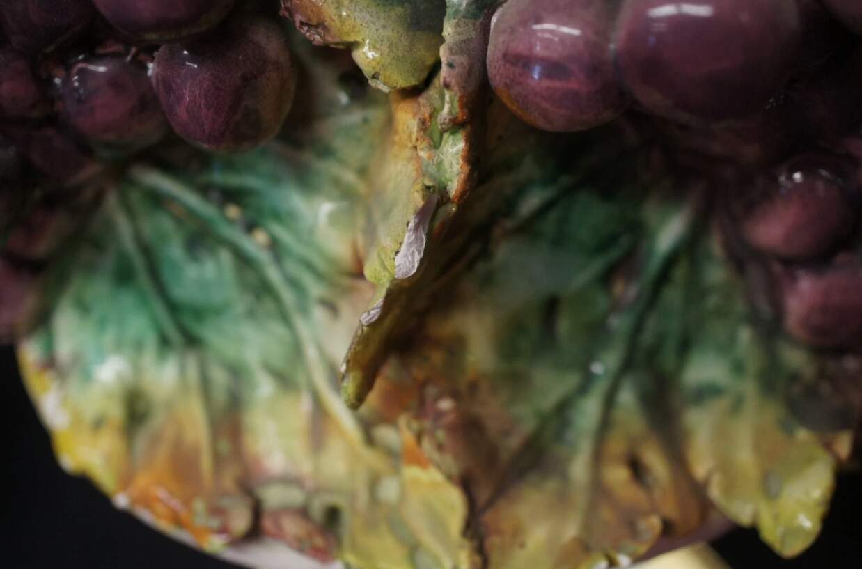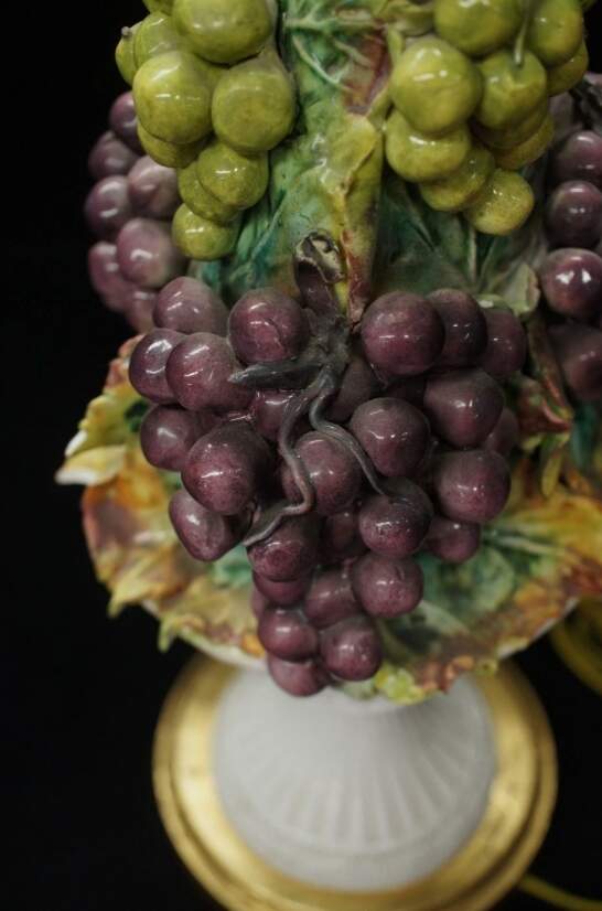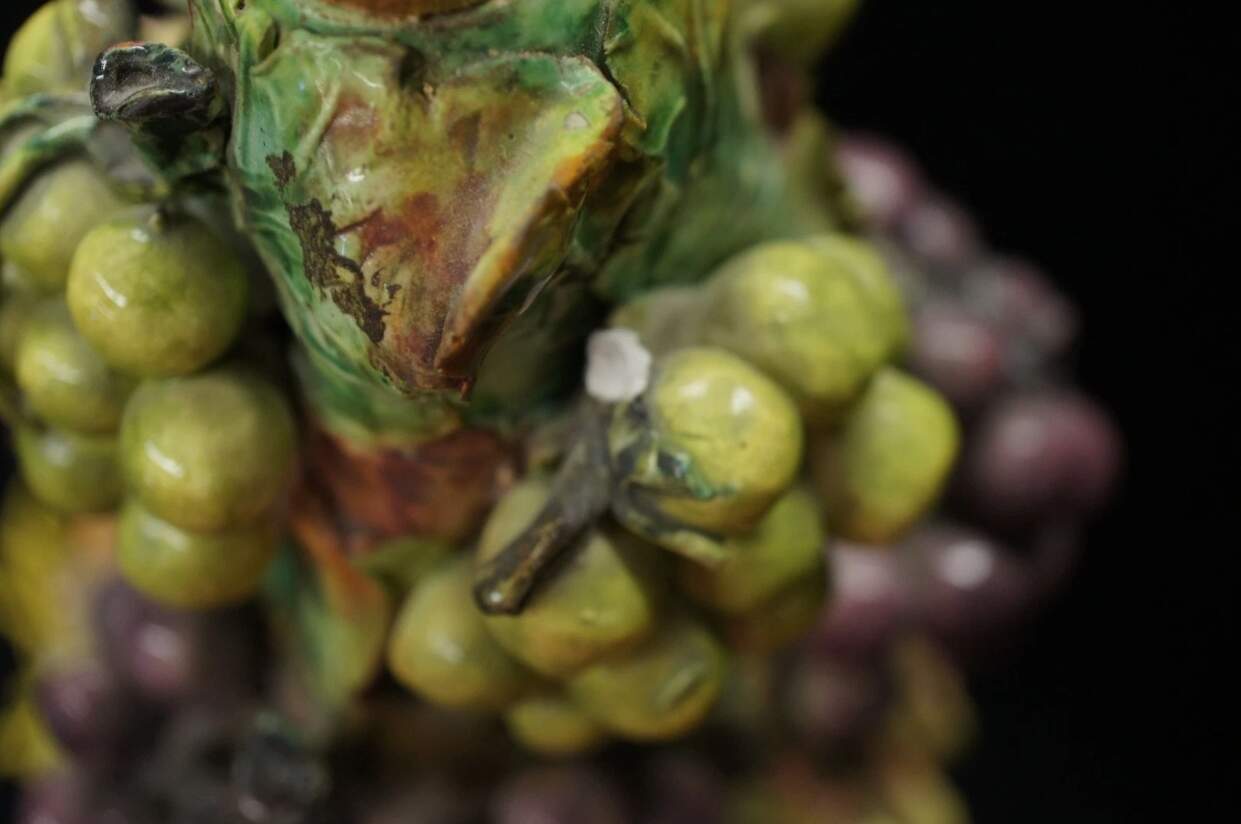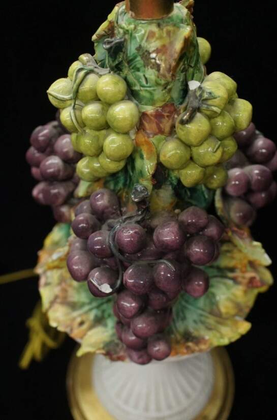 Maker unknown and features a hand painted green and purple grape design