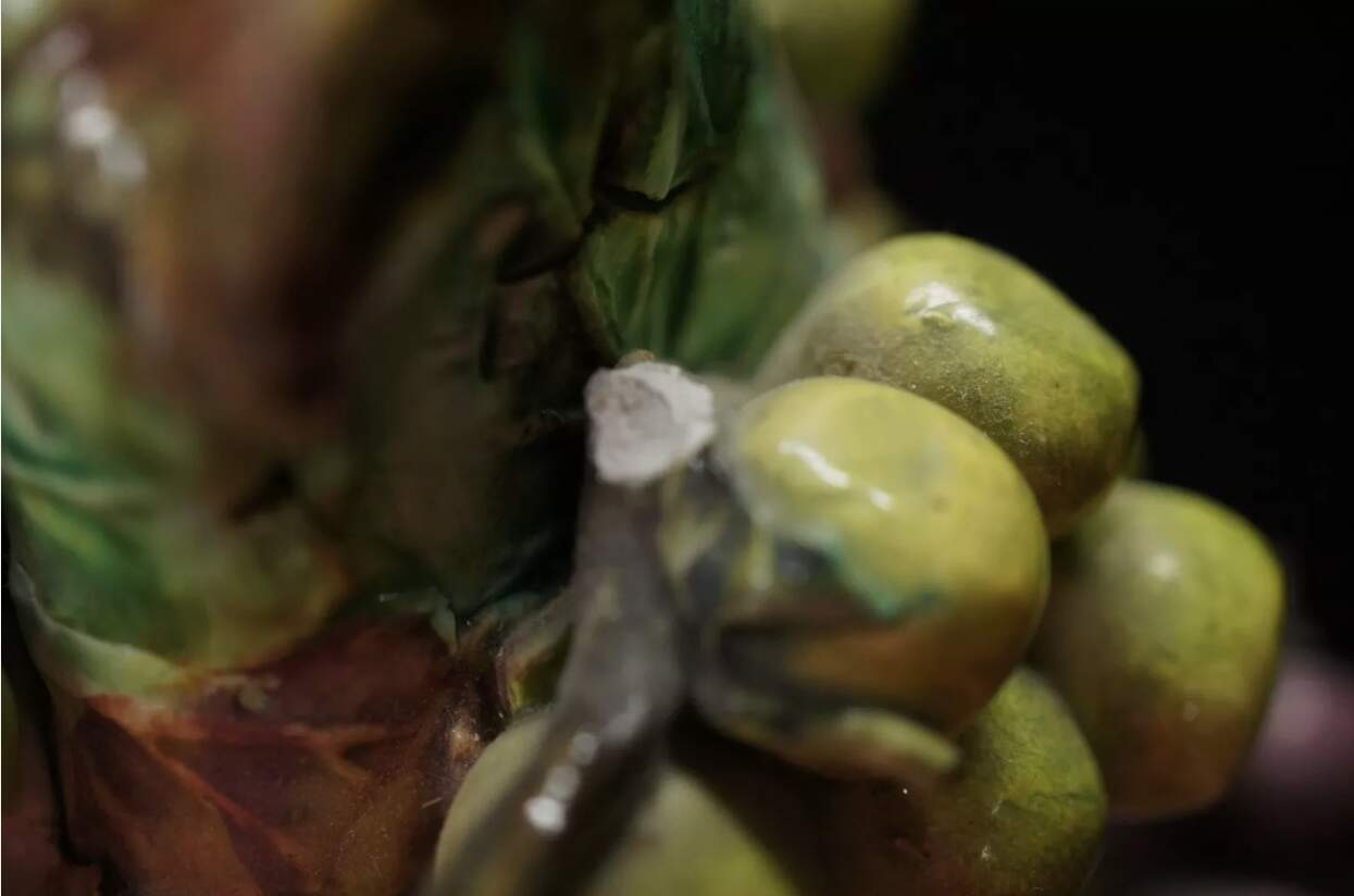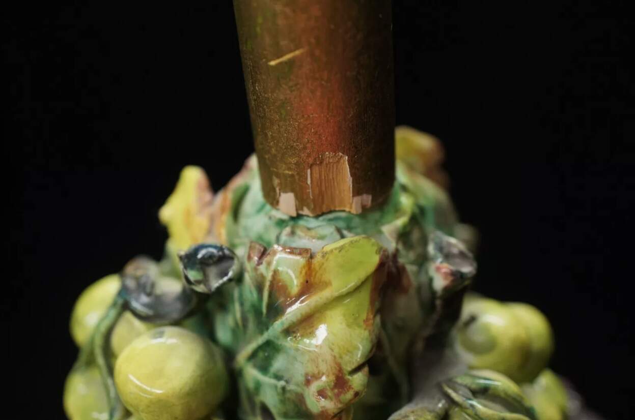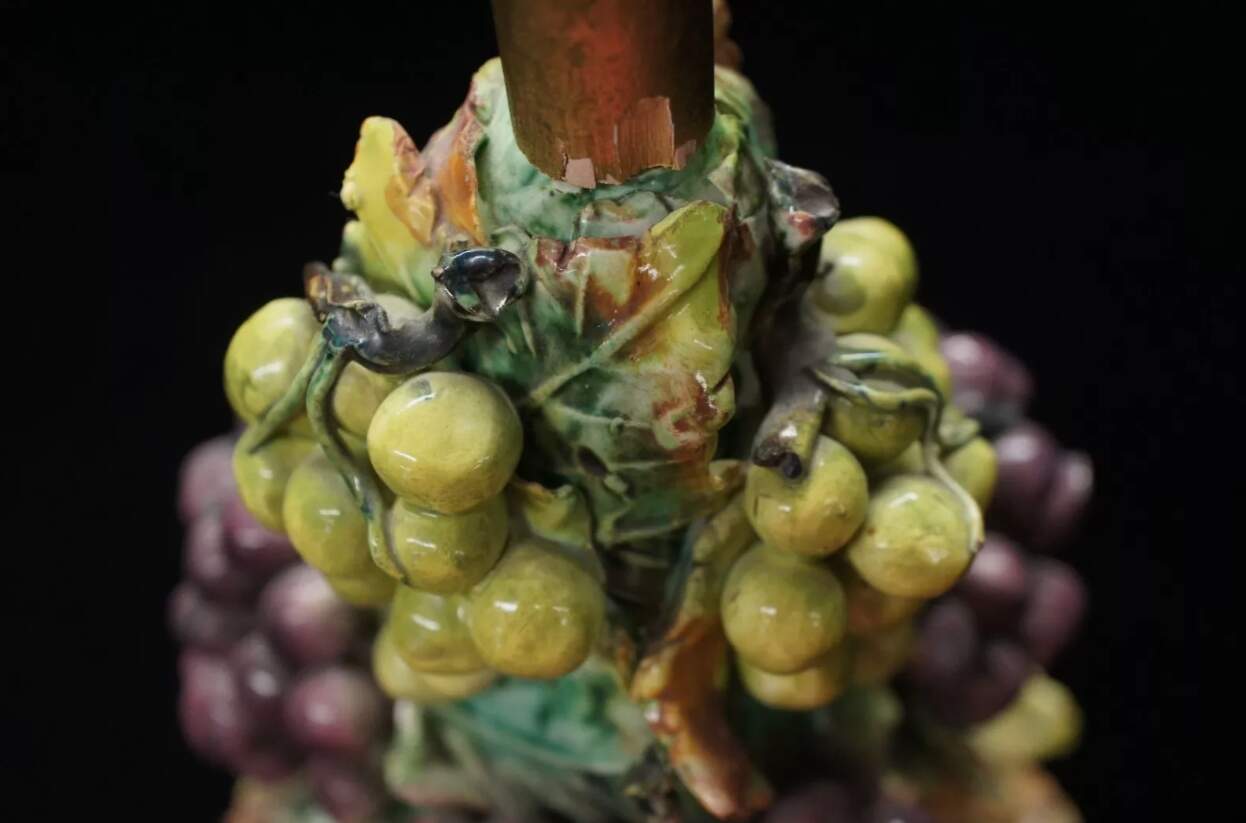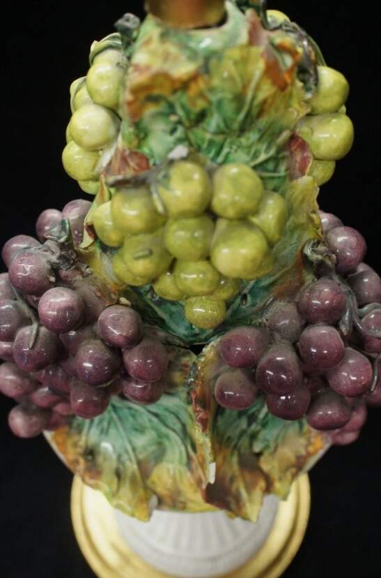 Maker unknown and features a hand painted green and purple grape design