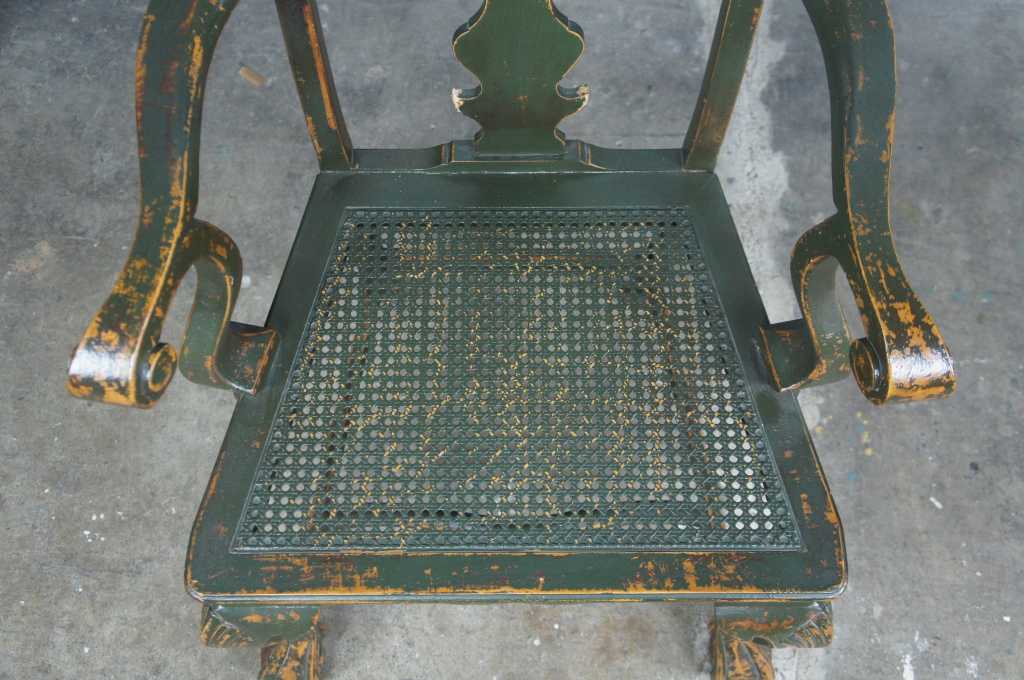 A gorgeous set of 19th century Chippendale inspired dining chairs. Distressed green with caned seats. Features a vase shaped splat and serpentine scalloped back. Cabriole legs connected by an H stretcher lead to ball and claw feet