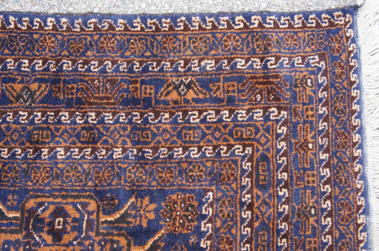 Vintage Persian Baluch wool area rug. Features a geometric repeating pattern with a field of navy blue accented with orange / brown, and tans. Baluchi rug, Baluchi also spelled Baloochi or Balochi, floor covering woven by the Baloch people living in Afghanistan and eastern Iran. The patterns in these rugs are highly varied, many consisting of repeated motifs, diagonally arranged across the field and a maze of intricate latch-hooked forms.