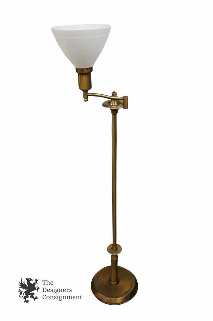 Vtg Heavy Brass Swing Arm Swivel Floor Lamp Milk Glass Shade Art Deco Read Light
