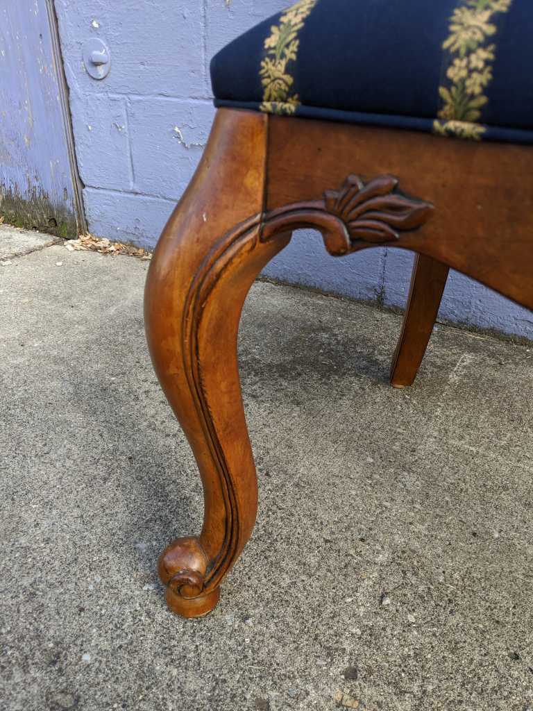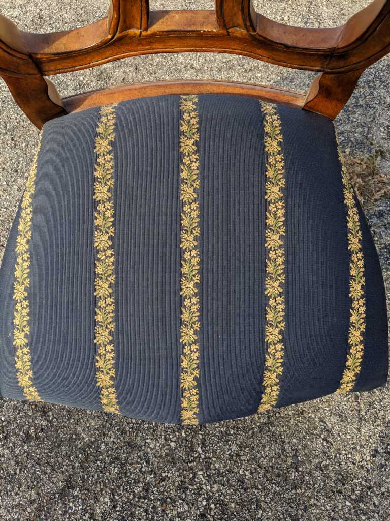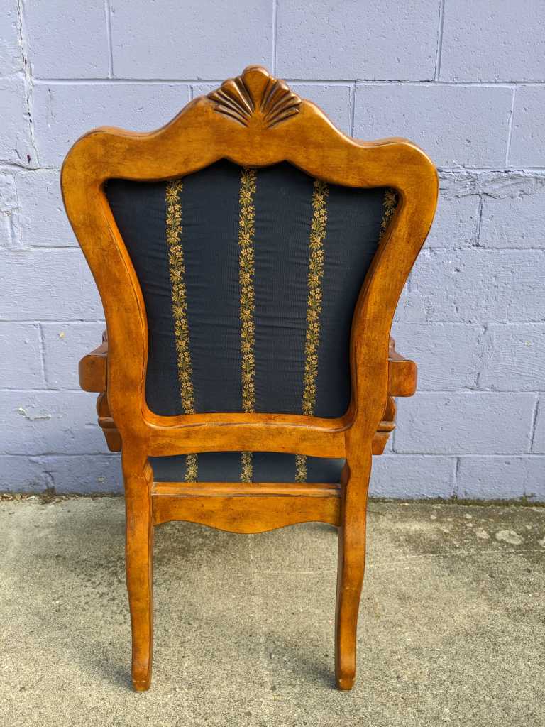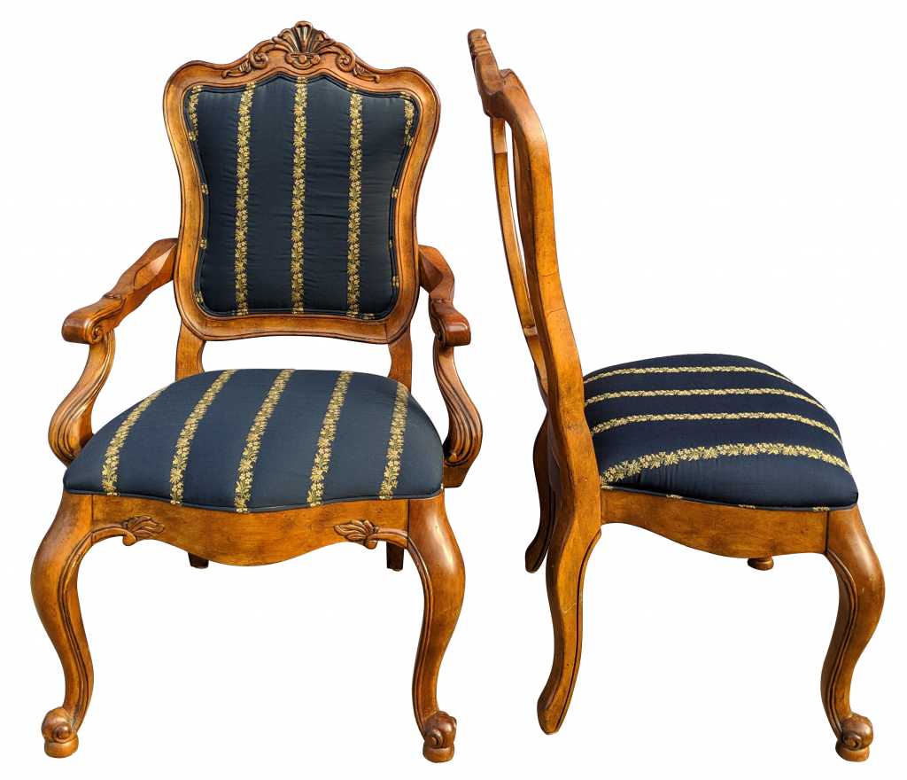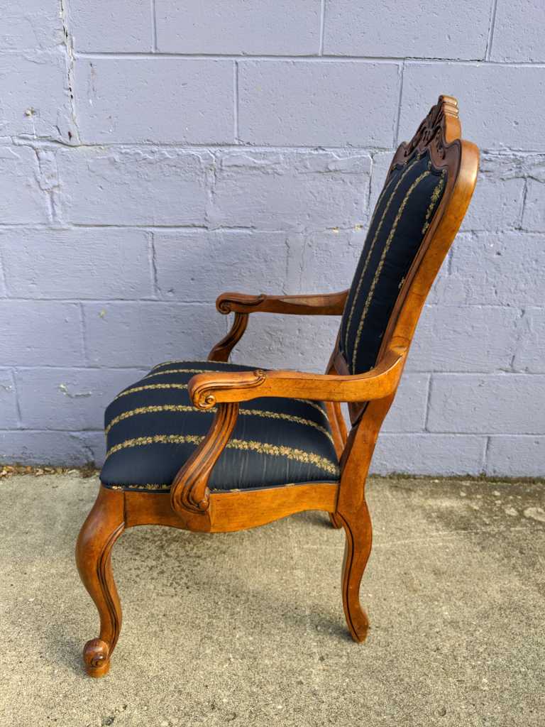 A set of eight “Tuscany Augustine” arm chairs by Ethan Allen. These Italian inspired dining chairs have serpentine backs with a carved crest, gently curved arms, serpentine aprons, and cabriole legs with scrolled feet to the front. The chairs have a beautiful blue upholstery with gold and green stripes of flowers.