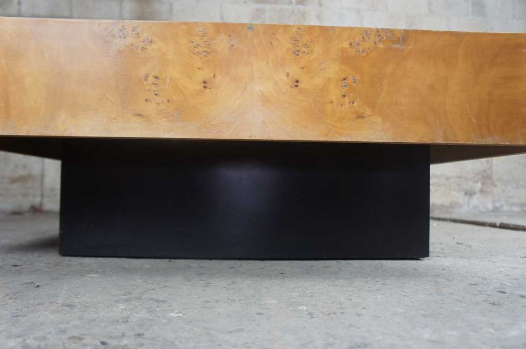 Vintage 1976 Milo Baughman cocktail table; features and olive wood book match veneer top; a minimalist square or cube design with a black pedestal base. Stamped 2754 on base.
