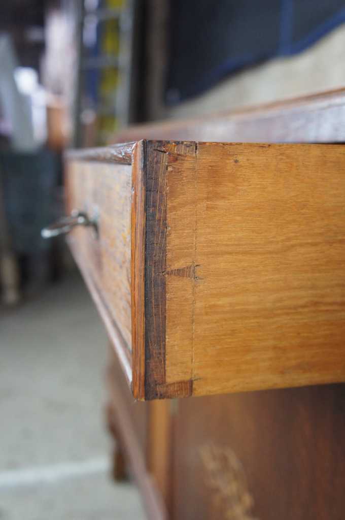 Imperfections are the result of aging; some rings to top, missing original backsplash, wear to front right trim edge.