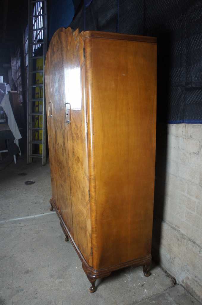 Early 20th Century French art deco armoire; made from oak with book match veneer front and waterfall sides; interior opens to a closet for hanging along one side and drawers and shelves along the other; this unit knocks down into three pieces for ease of movement.