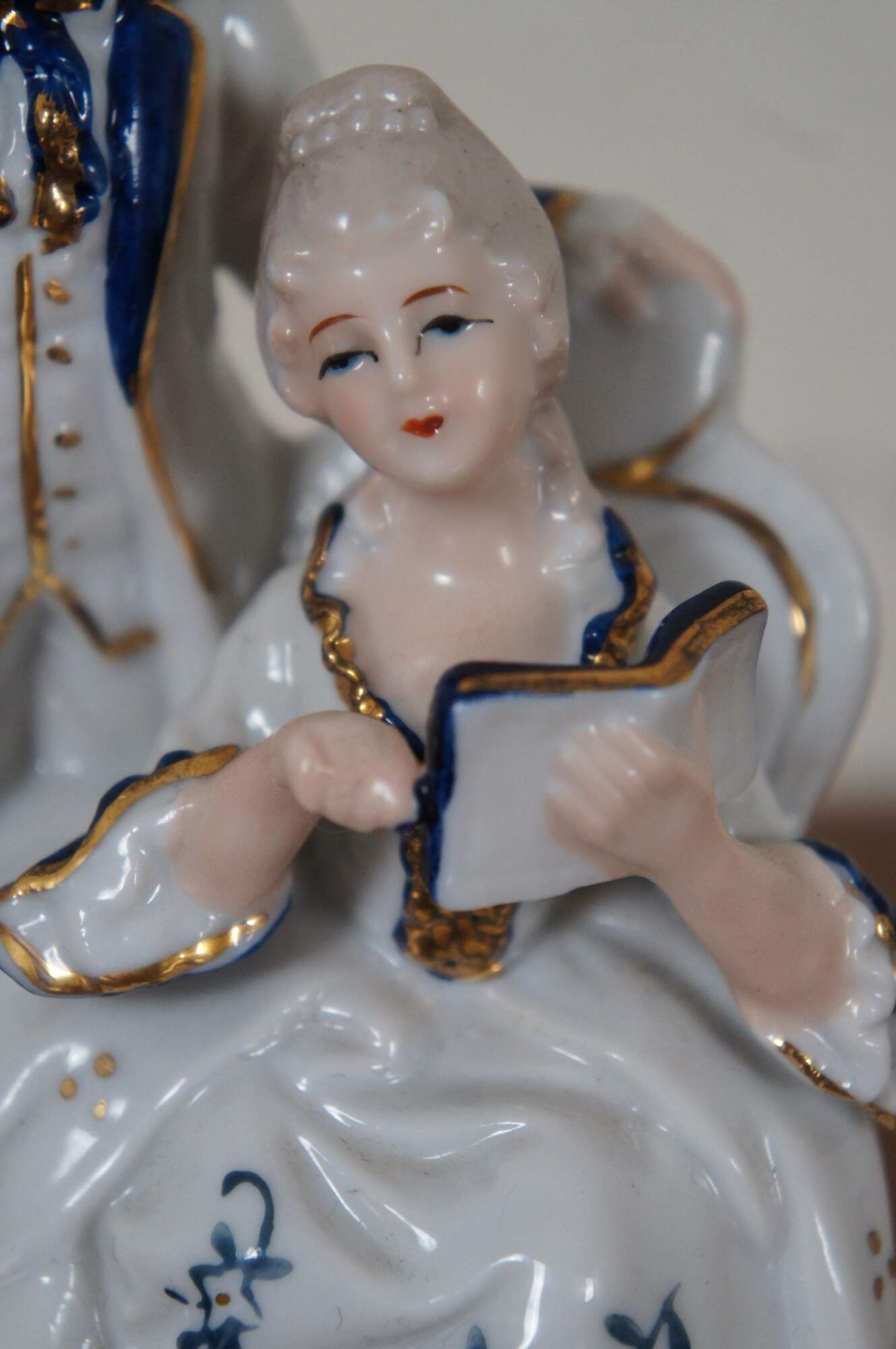 Vintage delft style blue and white porcelain figurine featuring a man and woman in chair, reading a book. Signed on base TC.