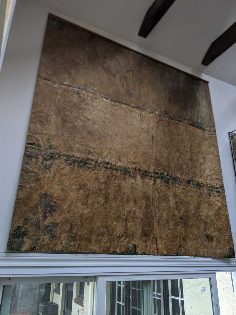 Leather tapestry artwork by Paolo Pelosini. Untiled. Paolo began his journey as a painter. He graduated from the Instituto D'Arte of Lucca in 1964 and from the Accademia D'arte of Florence in 1969. That year he moved to the U S and enroled in the M F A program at the University of Minnesota. In 1970 he switched to painting Conceptual Art. After teaching for two years at the Cleveland Institute Of Art he moves to New York in 1975. In 1982 begins sculpting, cutting found metal objects with an ax. Today he still uses the same method and materials, in his studios of Spanish Harlem and Massarosa.