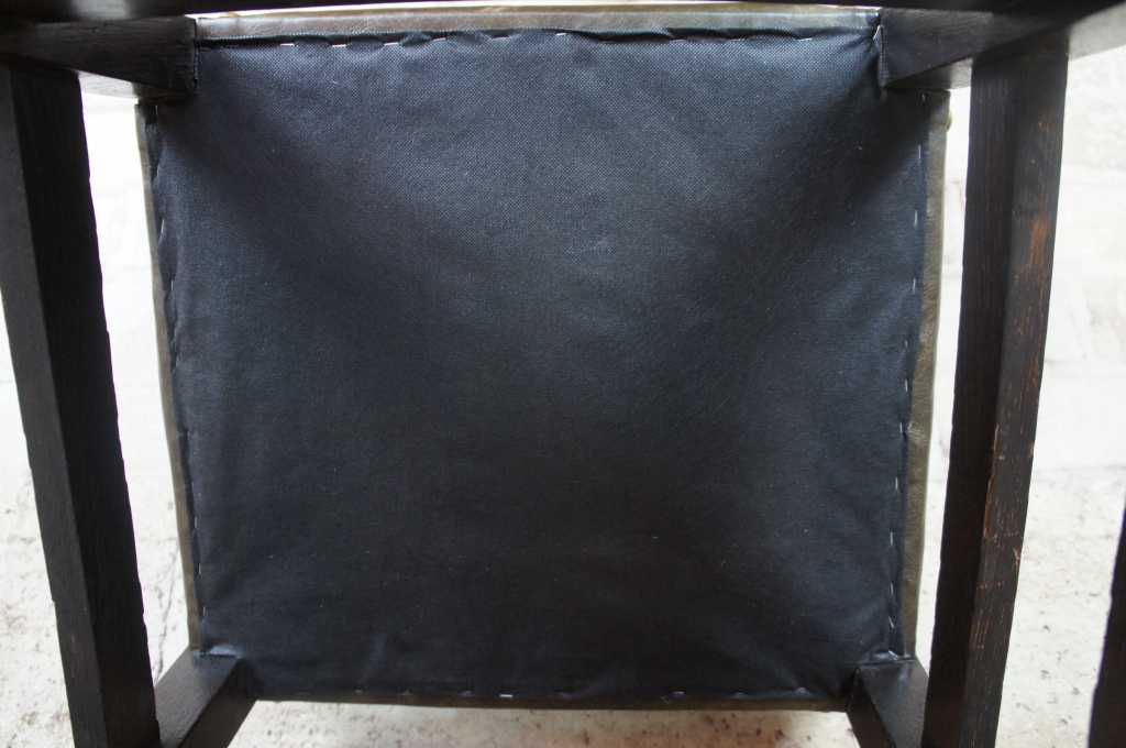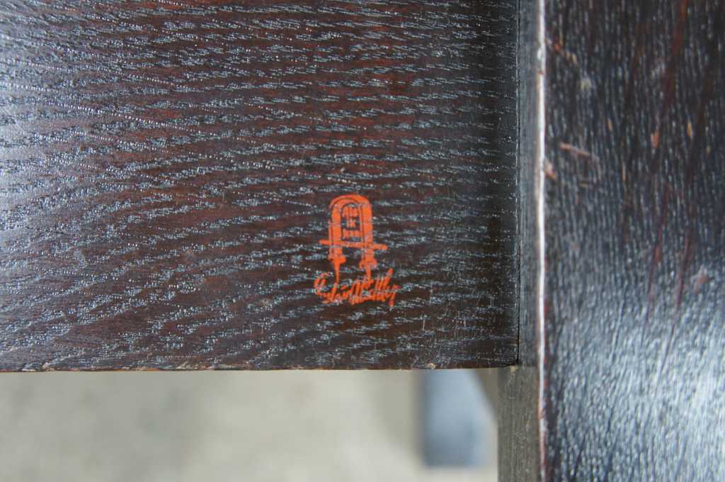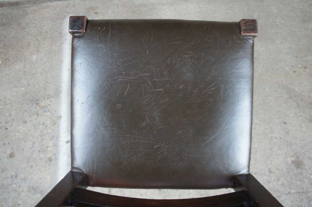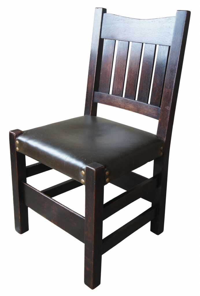 A beautiful Gustav Stickley side chair with leather seat and brass nailhead trim. Marked along the back, 1904-1907.