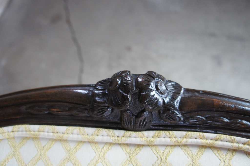 Louis XVI carved walnut bergere chair. Features a barrel back with floral accents. Upholstered in a cream and yellow diamond pattern. Springs are eight way hand tied.