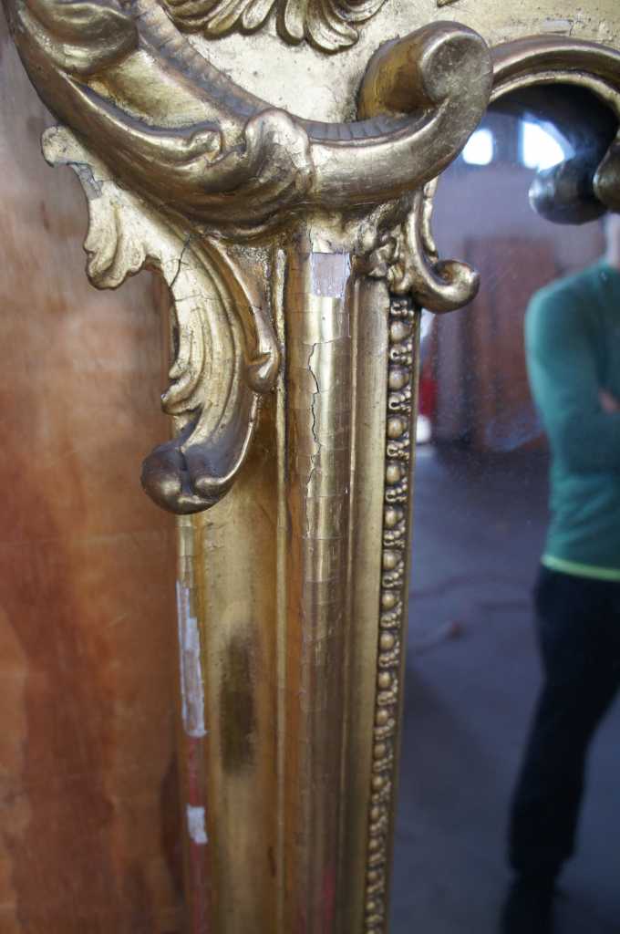 Good antique condition, paint / gesso wear and loss to frame and edges, some missing scroll work and past repairs.