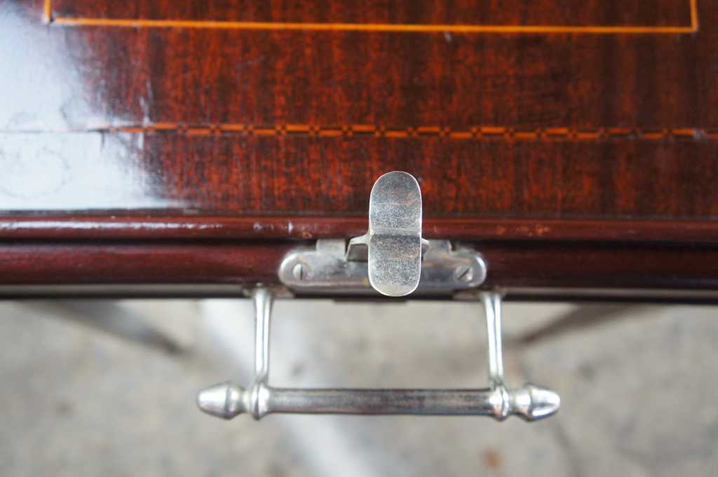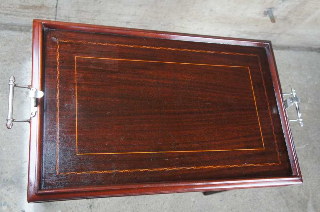 A Mid Century mahogany folding tray table, attributed to Scheibe. A neat inset design with banded inlay, handles and push buttons that neatly fold or release the legs.
