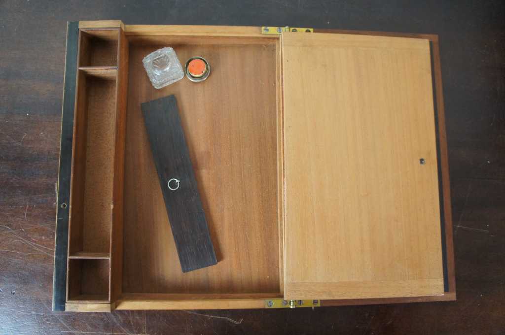 Gently Used – Pieces of veneer missing/chipped; key included but does not lock; catch for drop mirror sticks slightly; lower drawer is opened by pulling out bar in front edge of top compartment; Silver loss to mirror. see pictures