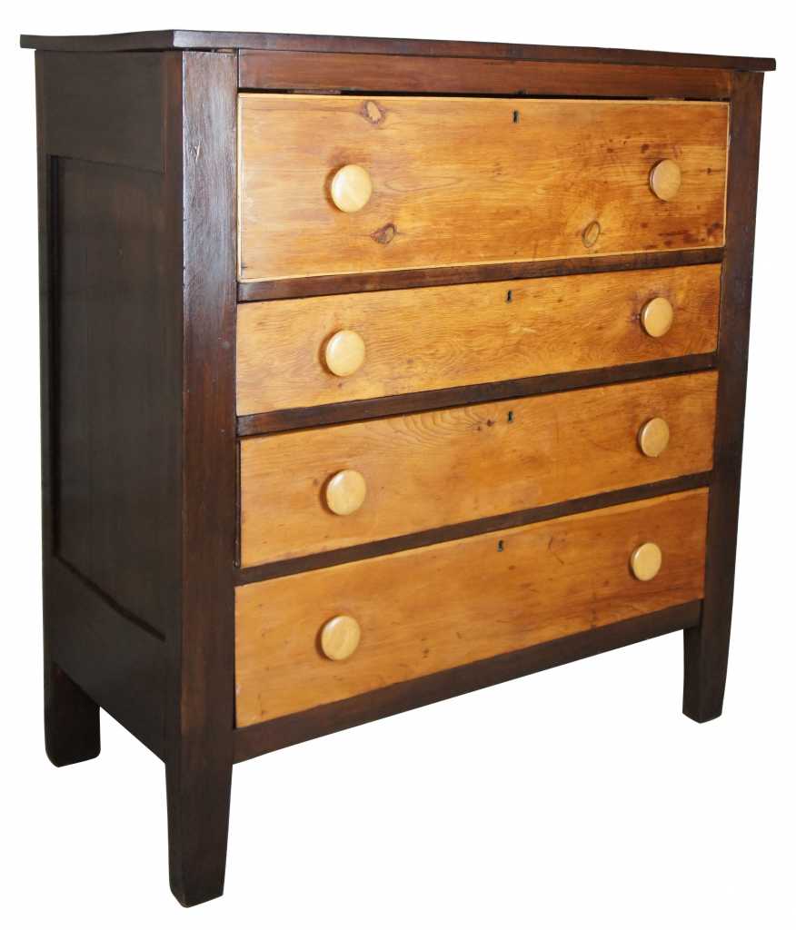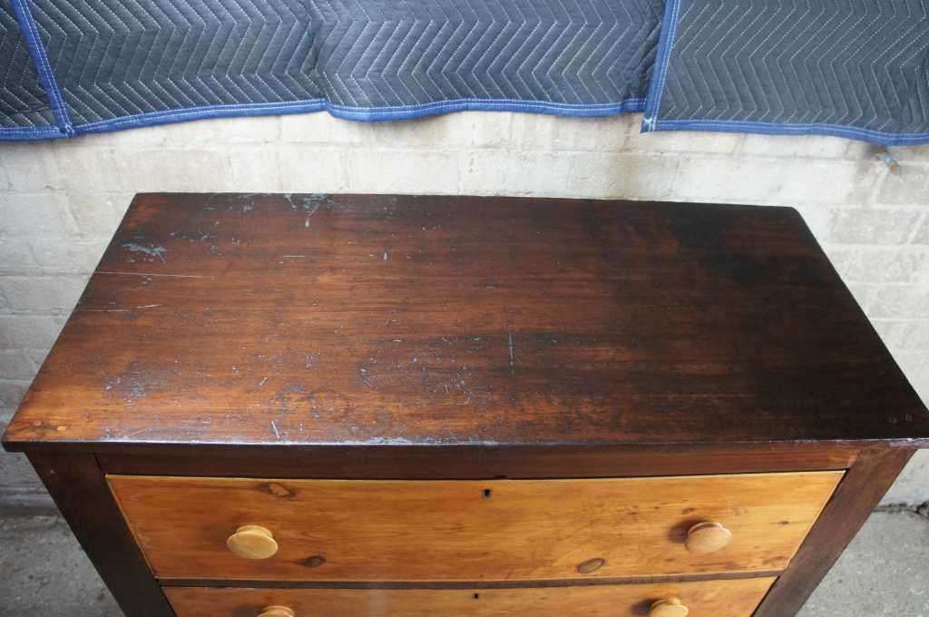 Imperfections are the result of aging; distressing and markings to top, split in back panel, old notch above top drawer from being pryed open