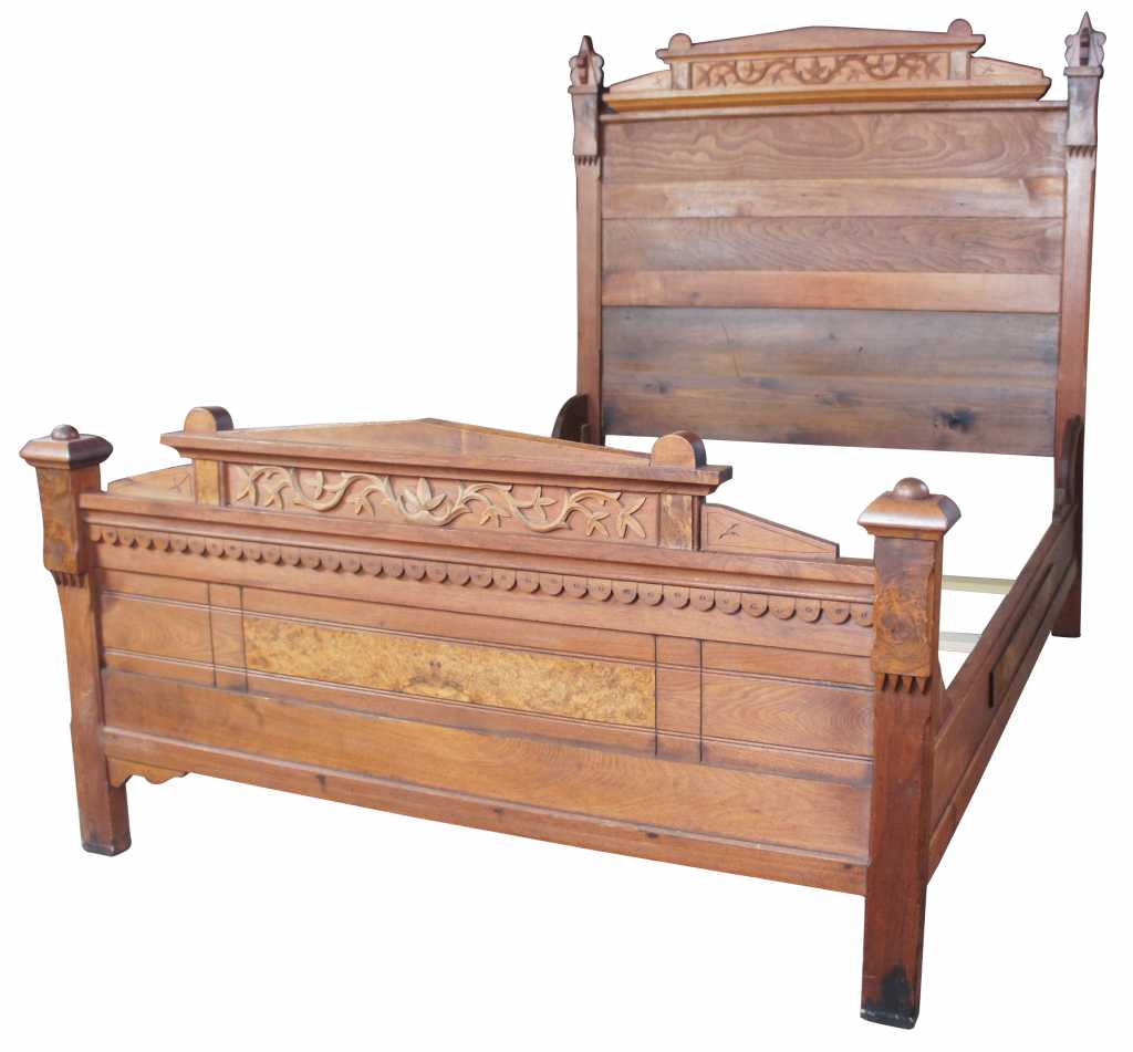 19th century Victorian walnut panel bed with burled accents and ornate carved details.