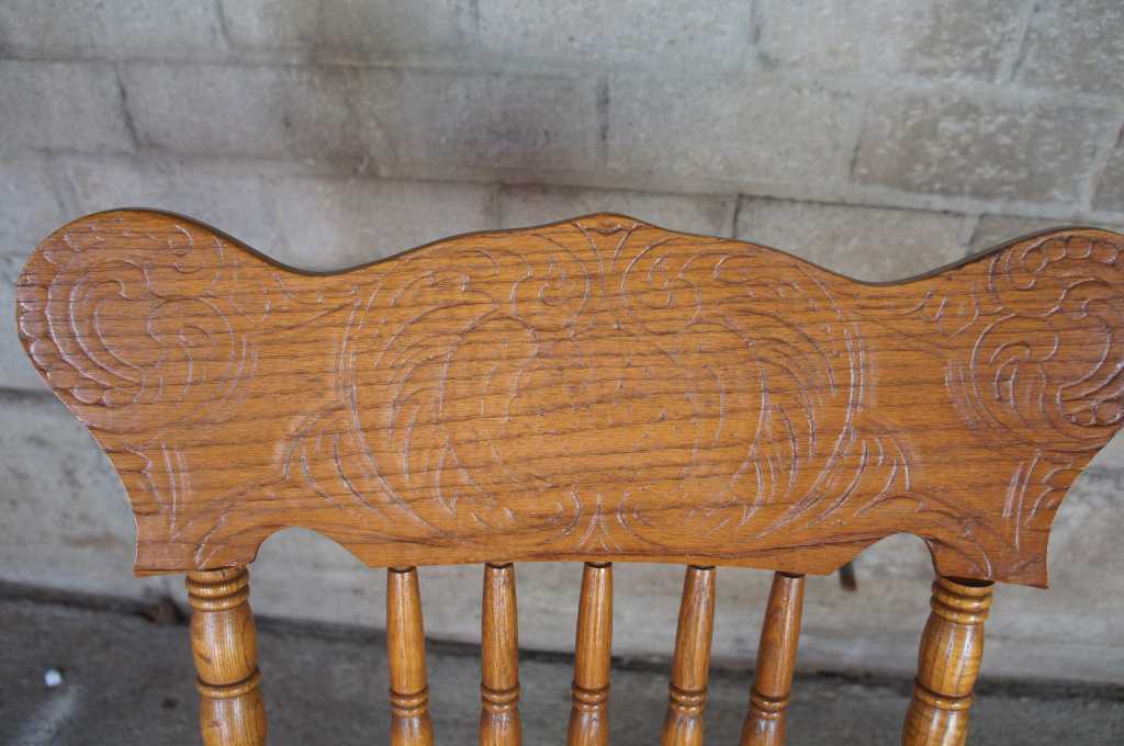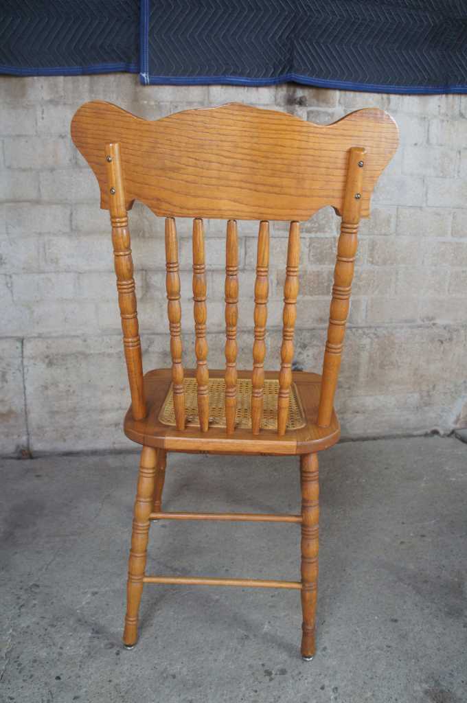 4 oak press back dining chairs with spindled back and cained seat. Shipping is estimated at $125-$275 unless picking up locally