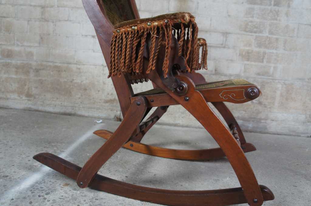 Circa 1880s campaign rocking chair. Made from walnut with engraved accents, pierced back and peacock tapestry seat.