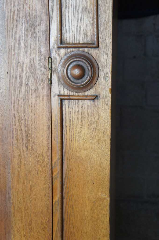 A neat turn of the century oak armoire featuring two long panel doors that open to hanging closet with shelf. Panels could easily be popped out and replaced with mirrors if desired.