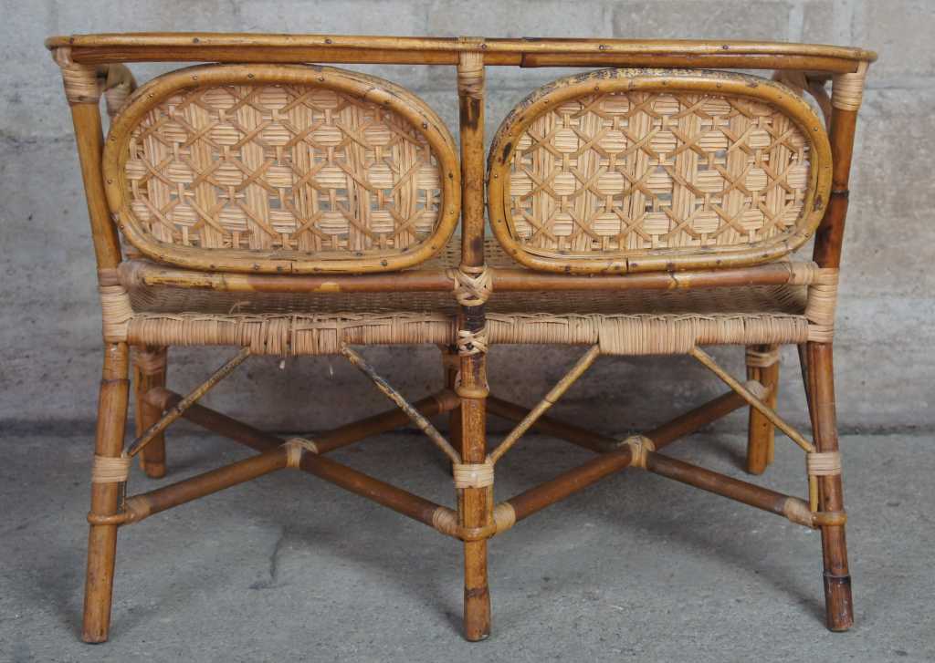 A gorgeous childrens love seat or settee. Made from bamboo with bentwood arms, barrel back and rattan seat.