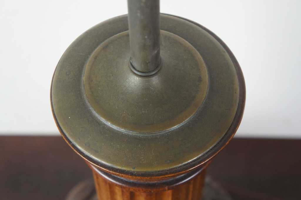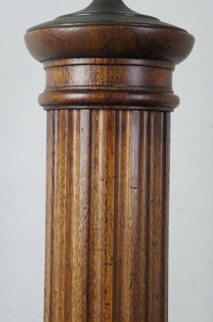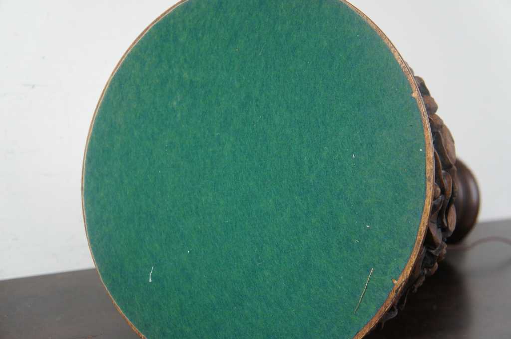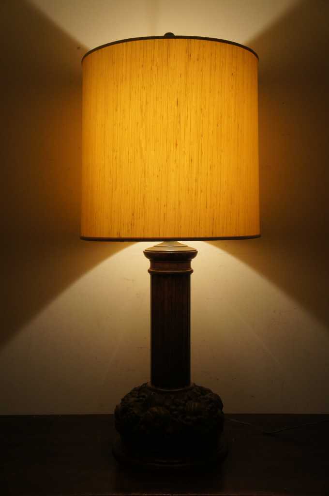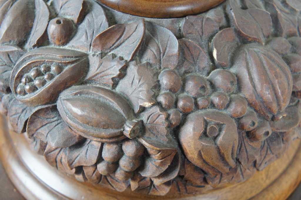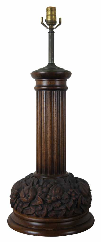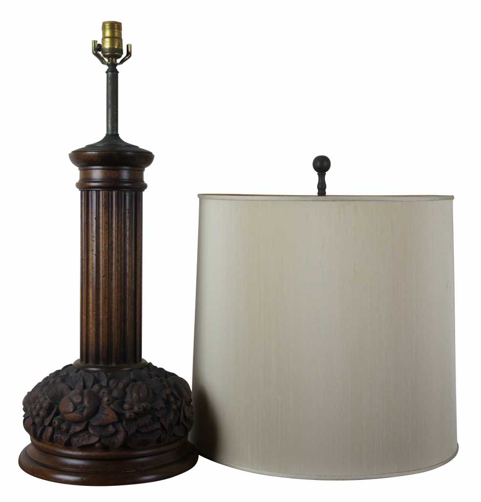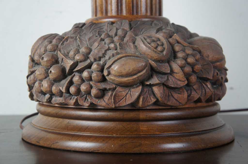 Large Victorian inspired carved mahogany table lamp. Features a bulbous base showing a hand carved fruit and nut design that leads to a fluted column.