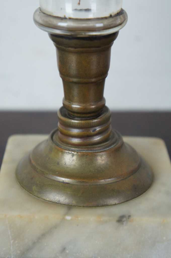 M. B. Co., NY Kerosene Lantern. Features a marble base and brass support leading to glass. Shade is hand painted with floral design. Circa 1900s.